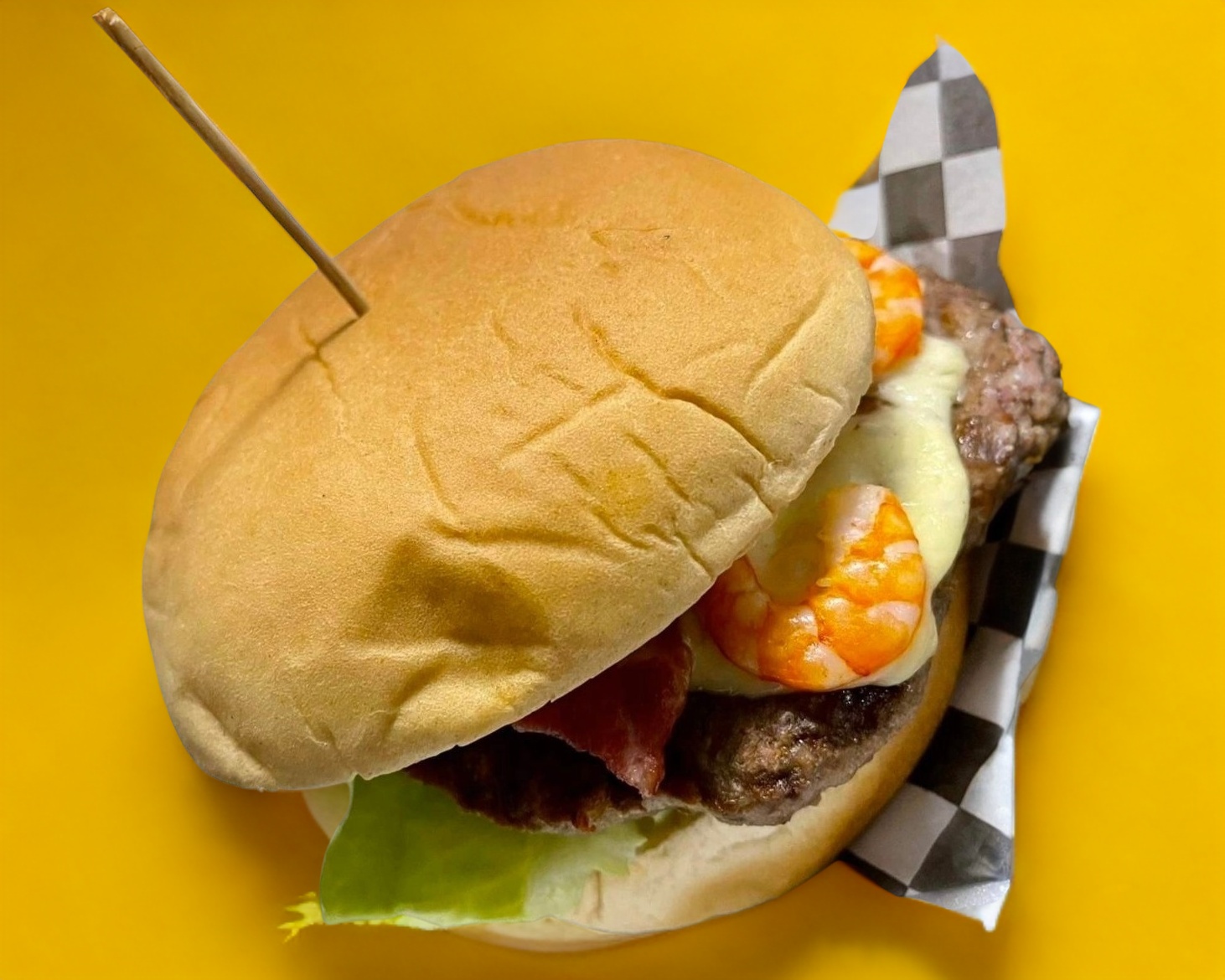 Carne arrachera, queso blanco, camarón en mantequilla, pan sin ajonjolí, líquidos, verduras.