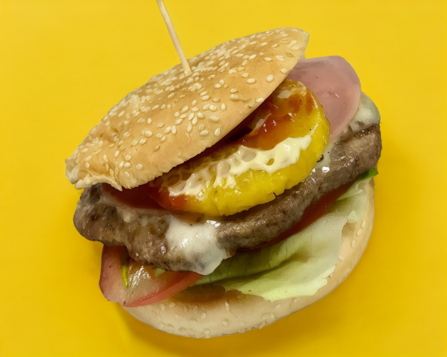 Carne arrachera, piña, queso amarillo, pan con ajonjolí, líquidos, verduras.