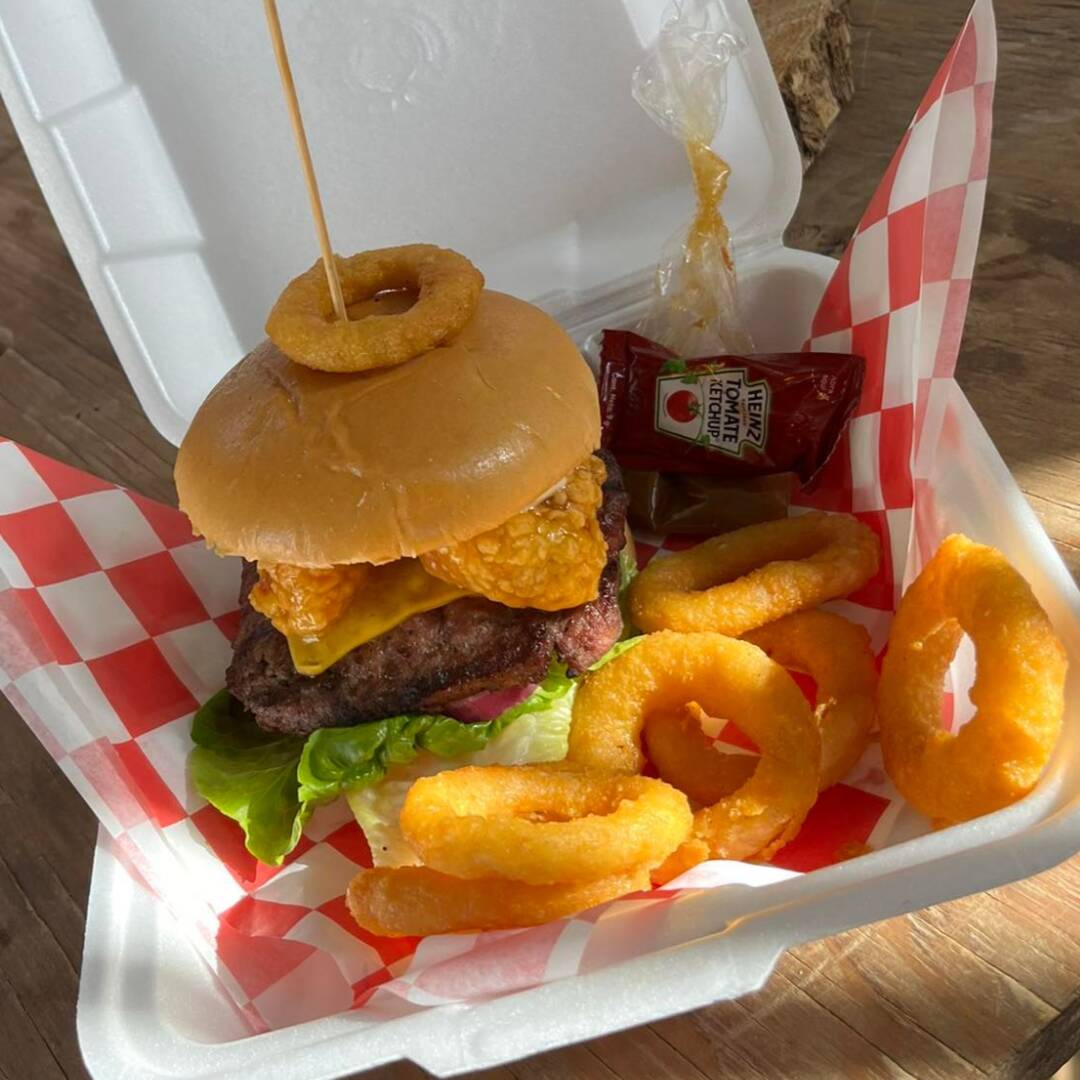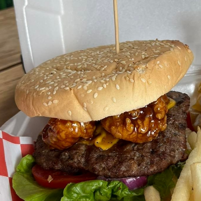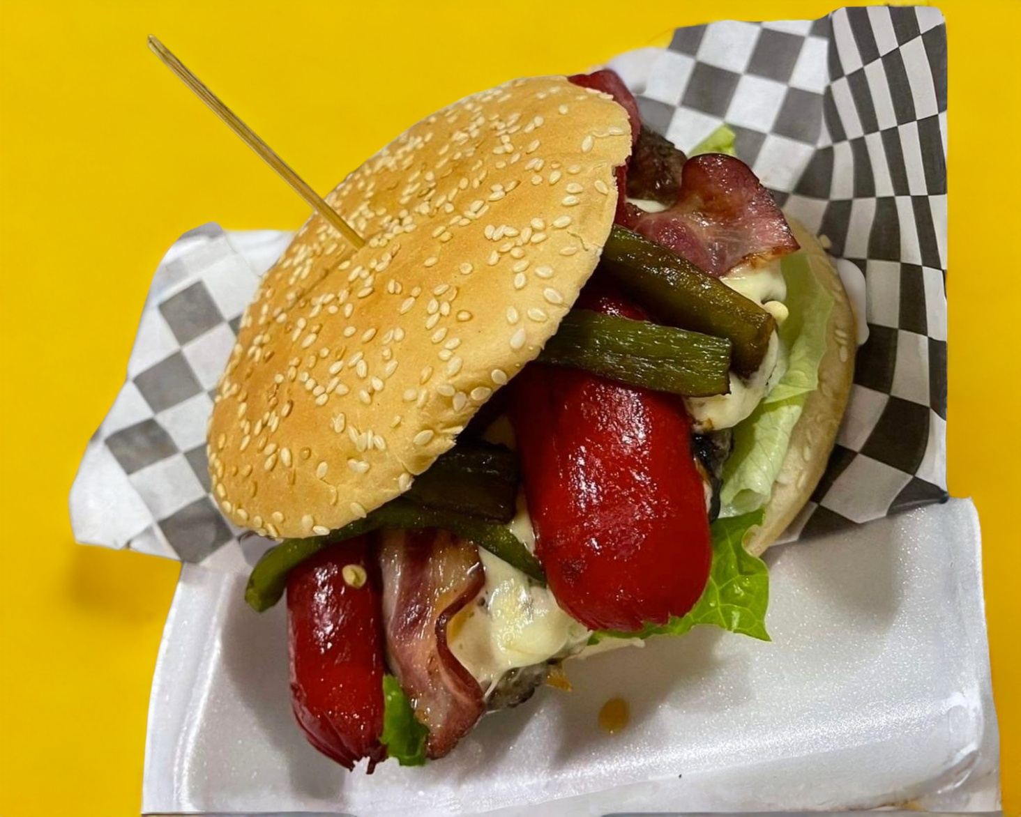 Carne arrachera, tocino, queso amarillo, pimientos al fuego, salsa BBQ, pan con ajonjolí, líquidos, verduras.