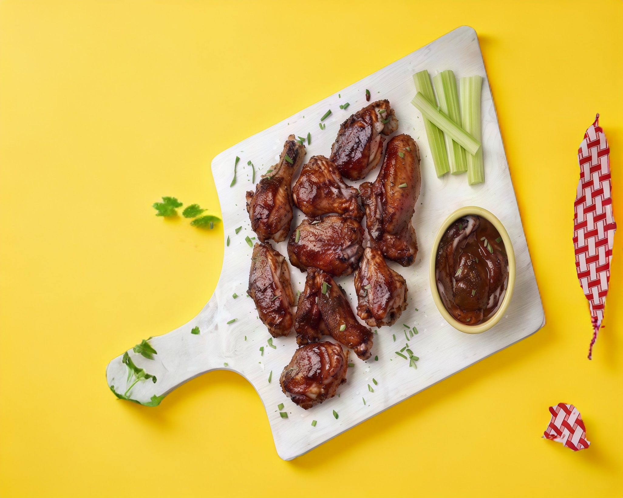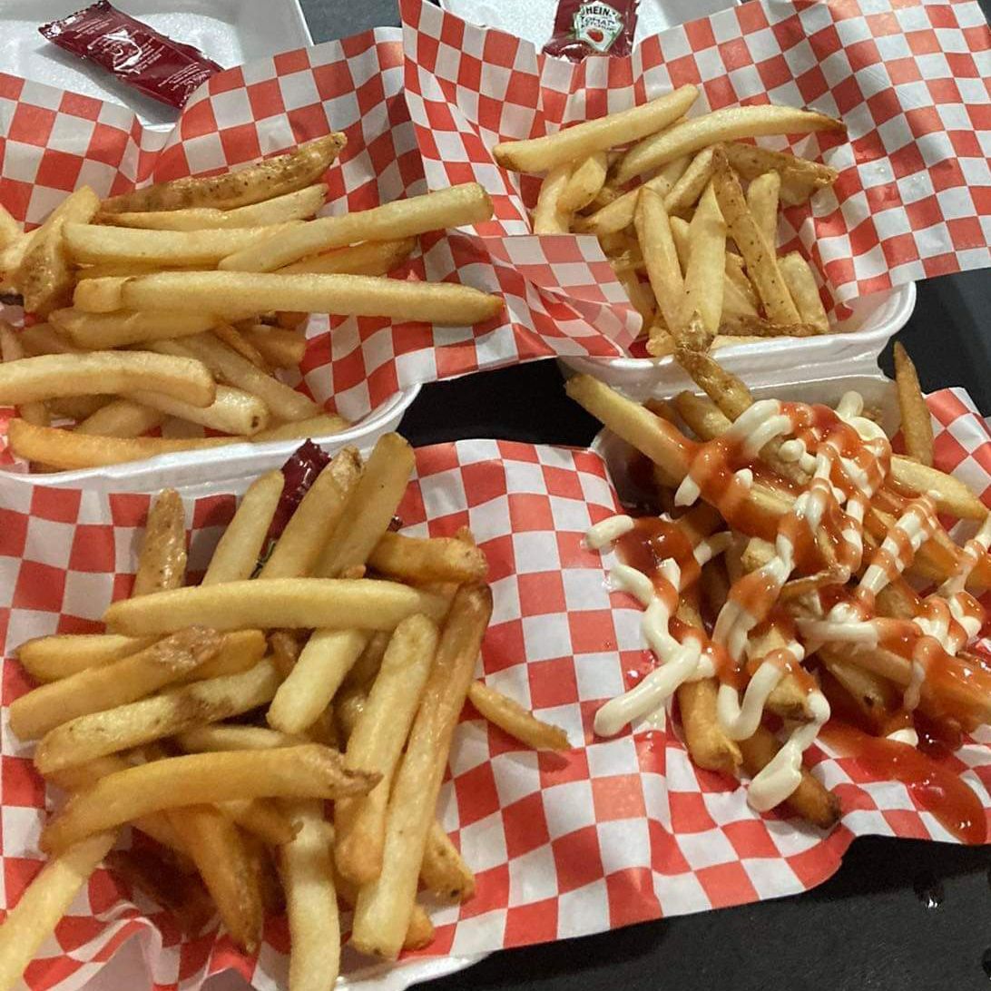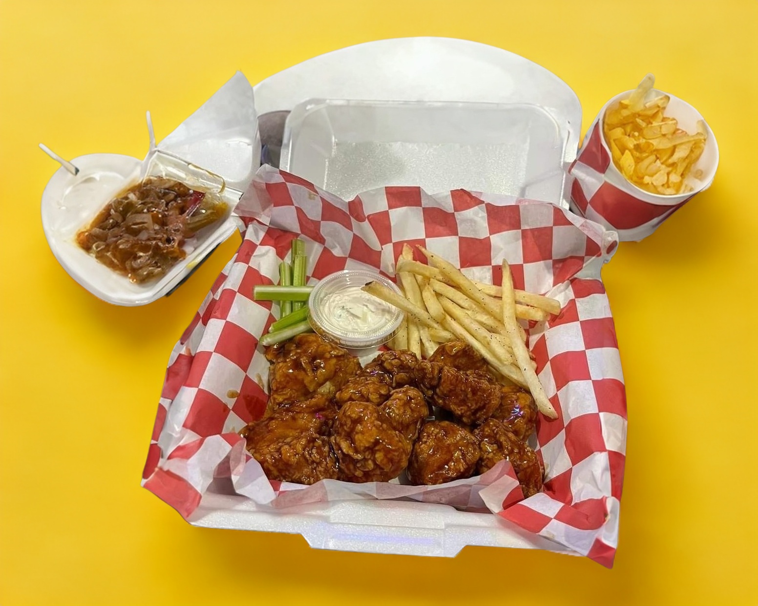 300 gramos de pechuga de pollo, papas, aderezo y salsa de alitas de su preferencia.