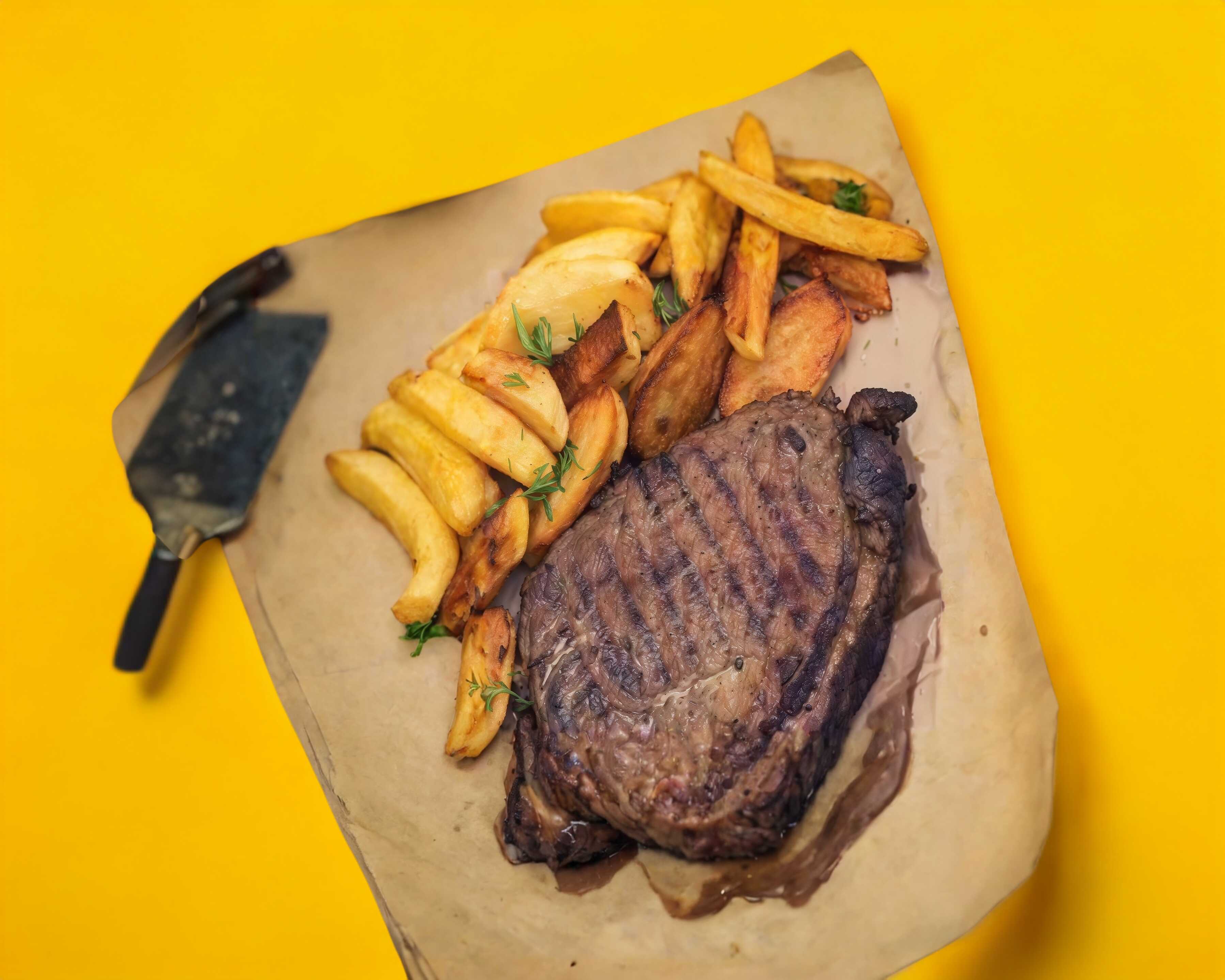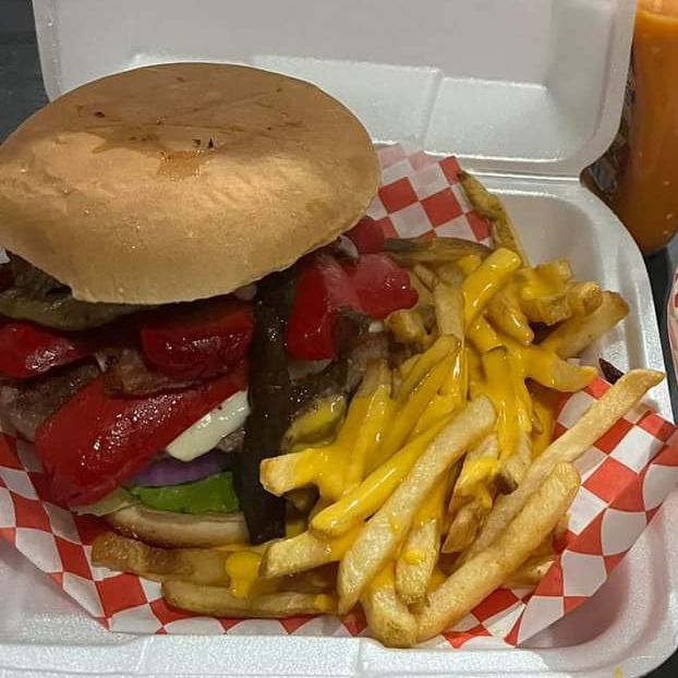 Carne arrachera, tocino, queso amarillo, pimientos al fuego, salsa BBQ, pan con ajonjolí, líquidos, verduras y papas.