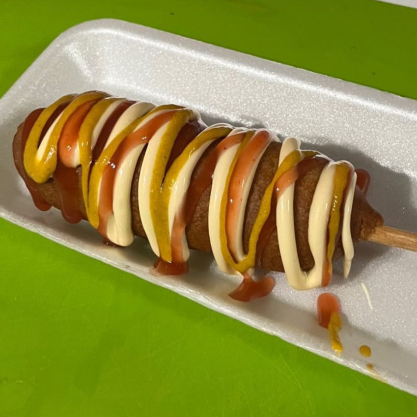 banderilla como hot dog con mostaza, ketchup y mayonesa