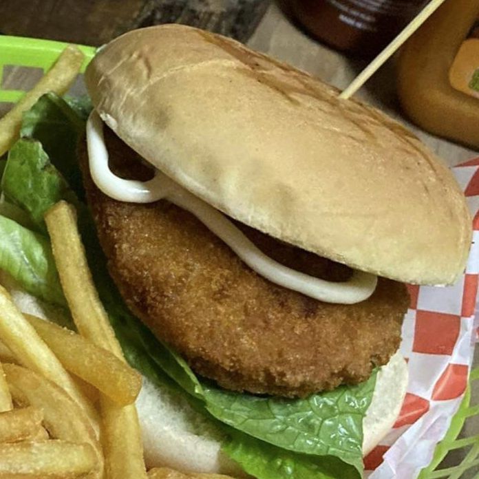 Pollo frito, queso amarillo, pan sin ajonjolí, líquidos, verduras y papas.