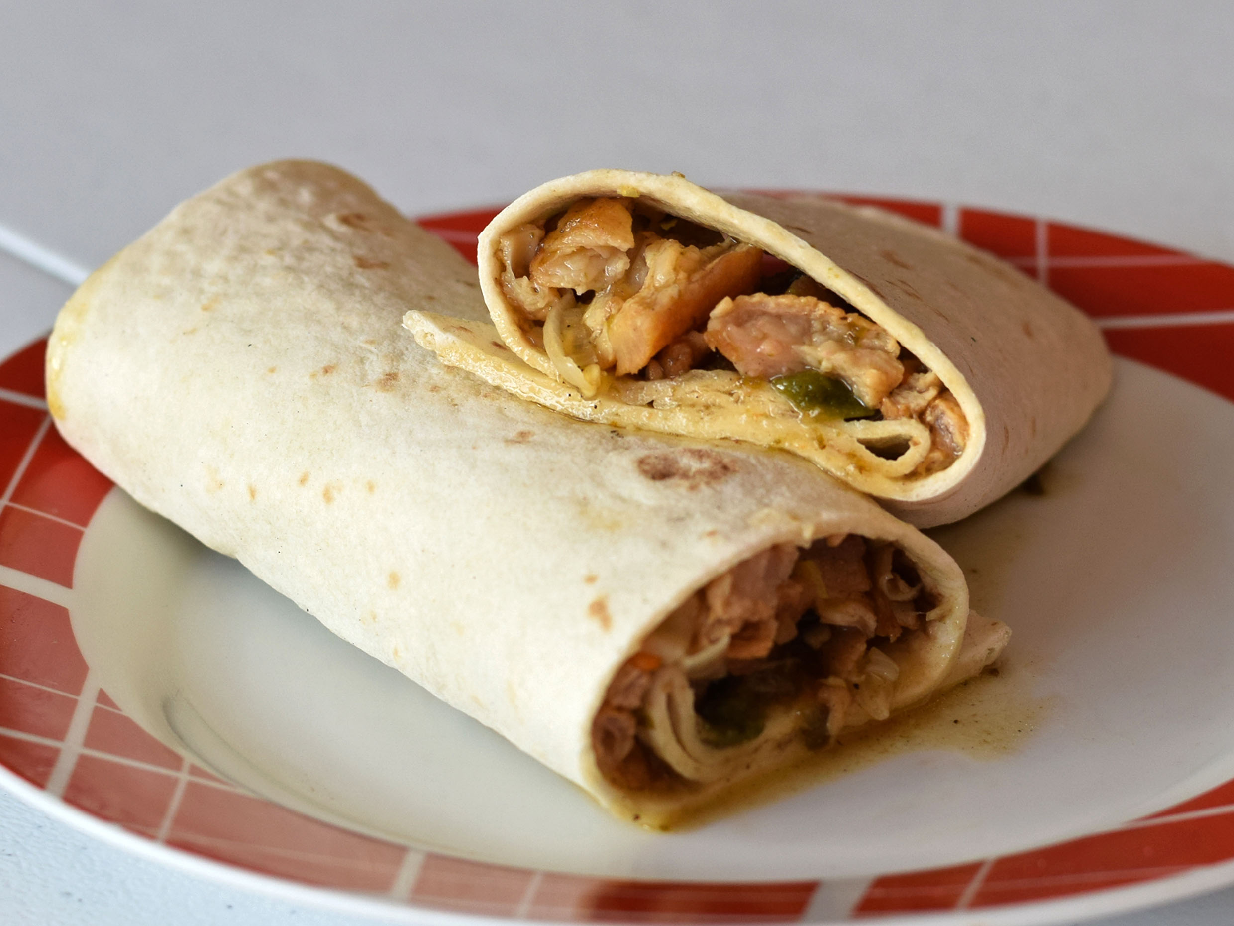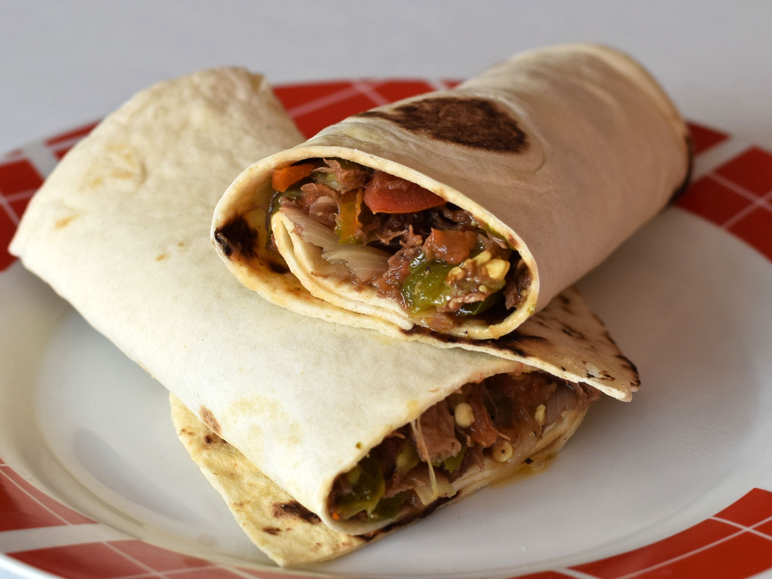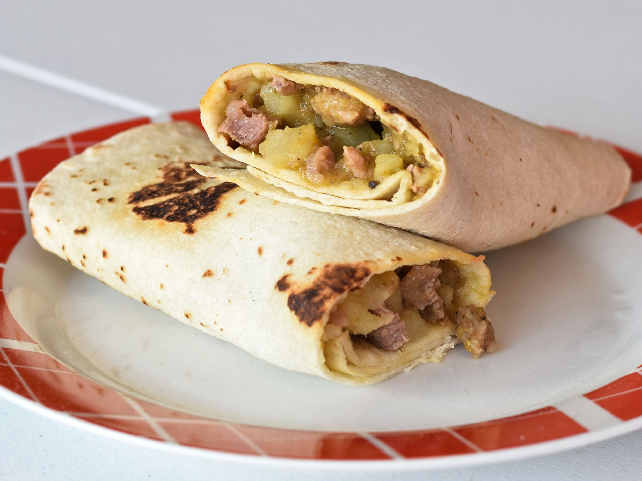 Tortilla estilo burrito, carne de puerco, carne res, uñé rojo, jamón y chile colorín
