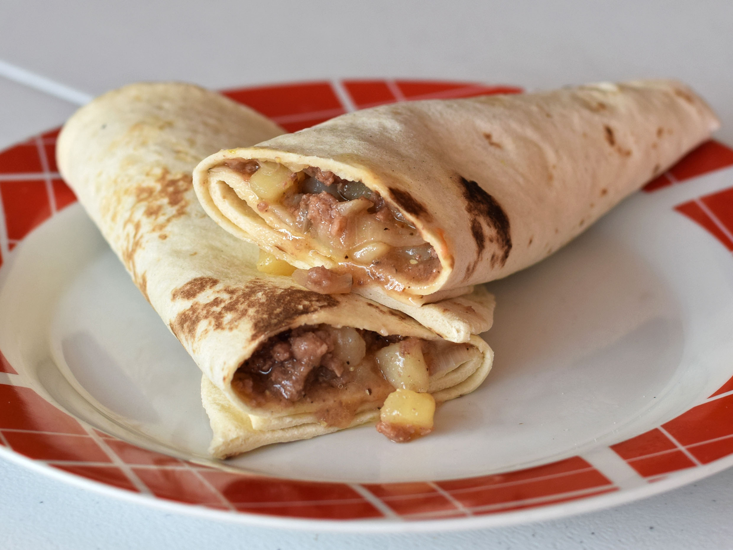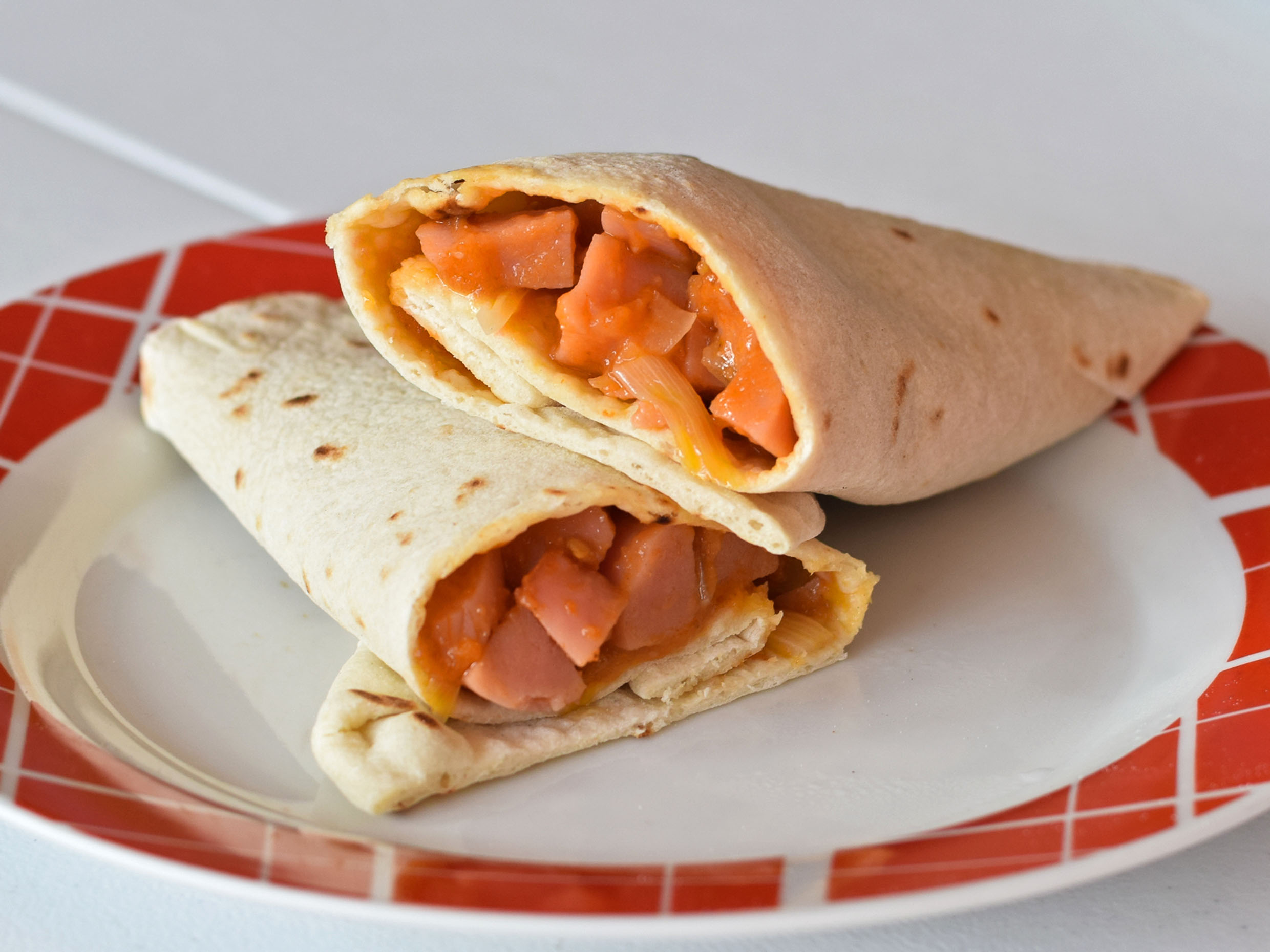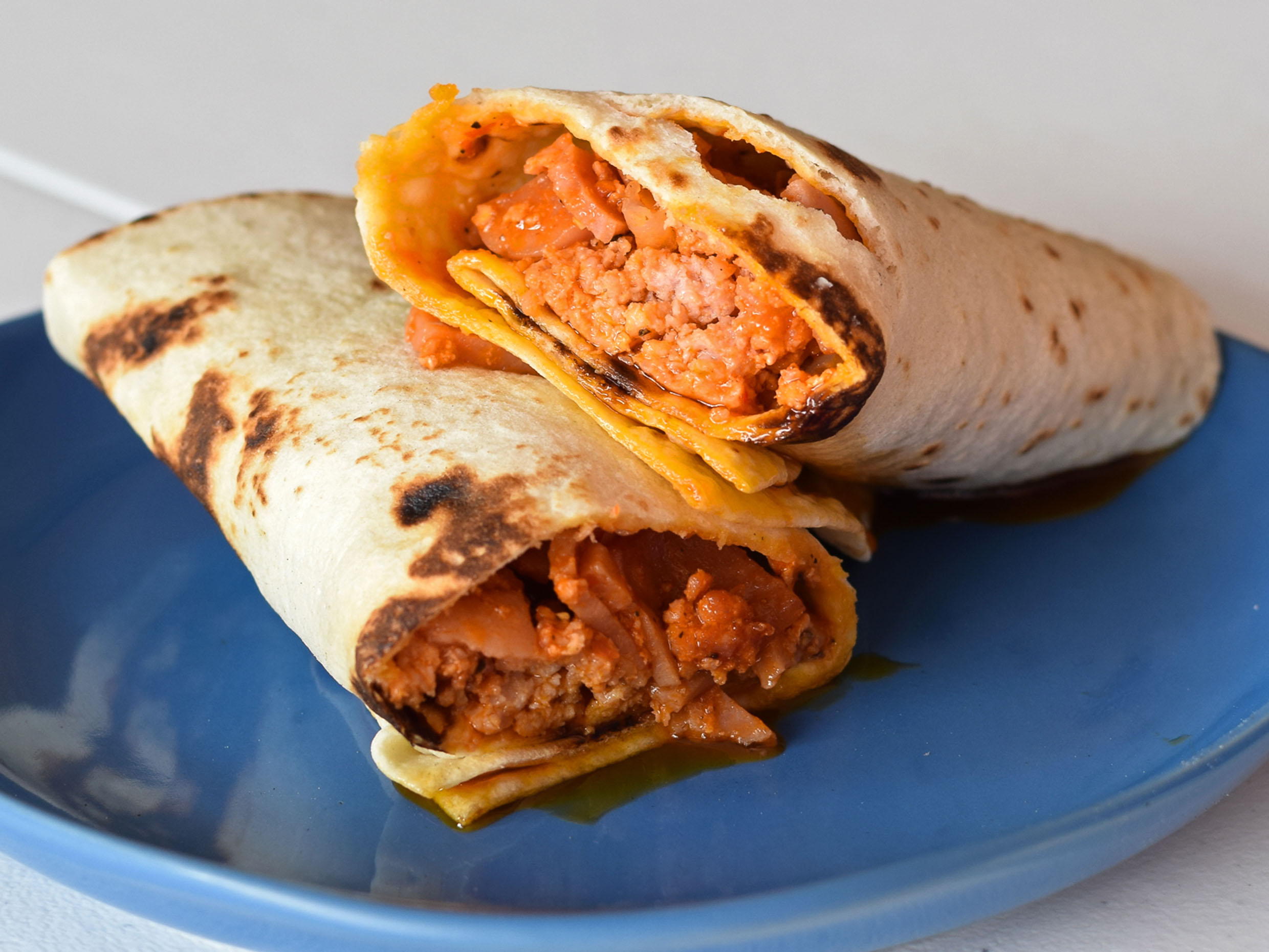 Tortilla estilo burrito, carne de puerco, carne res, uñé rojo, jamón y chile colorín