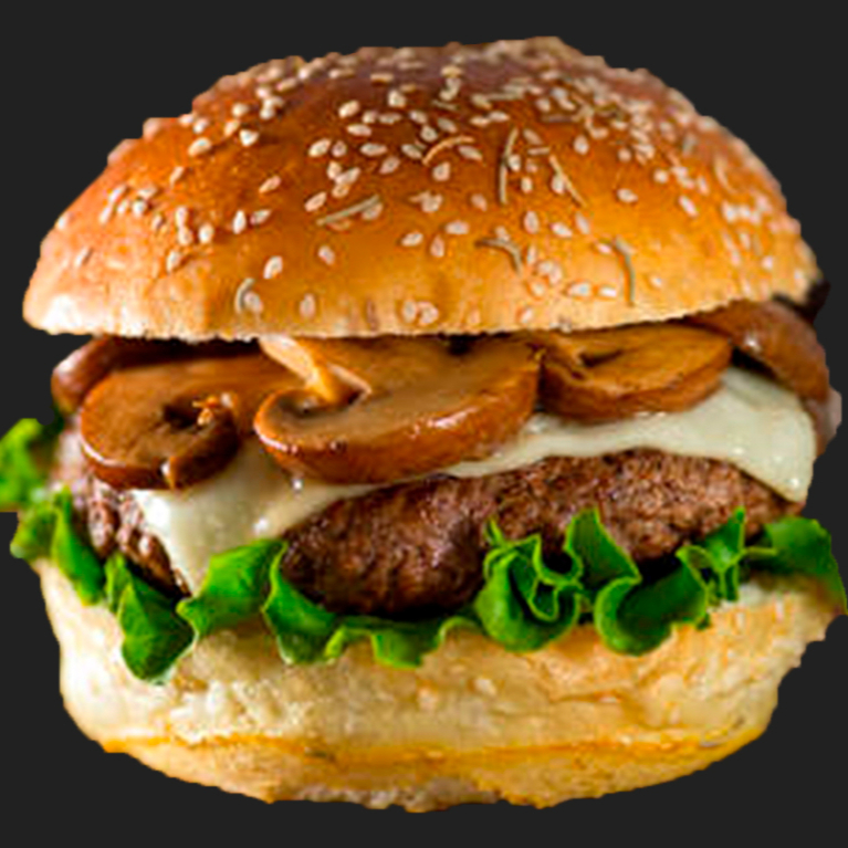 Carne 100% sirloin de res 1/3 de lb, queso, champiñones, cebolla caramelizada, vegetales y aderezos.
