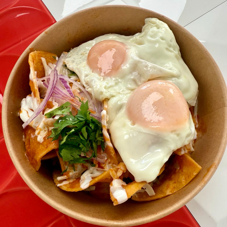 El desayuno perfecto: chilaquiles en salsa a elegir con 2 huevos (estrellados o revueltos), queso, crema, cilantro y cebolla.