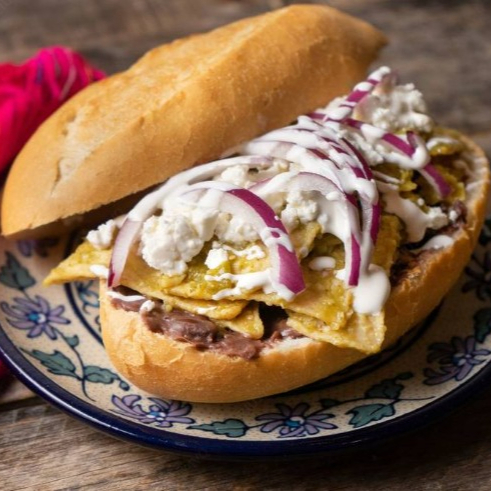 Torta rellena de chilaquiles en salsa a elegir, acompañada de pollo deshebrado, queso, crema, cebolla y cilantro.