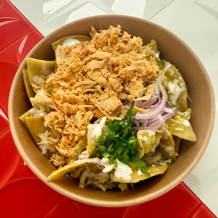 Práctico paquete que incluye chilaquiles con pollo en salsa a elección (queso, crema, cilantro y cebolla) y una soda de 600 ml.