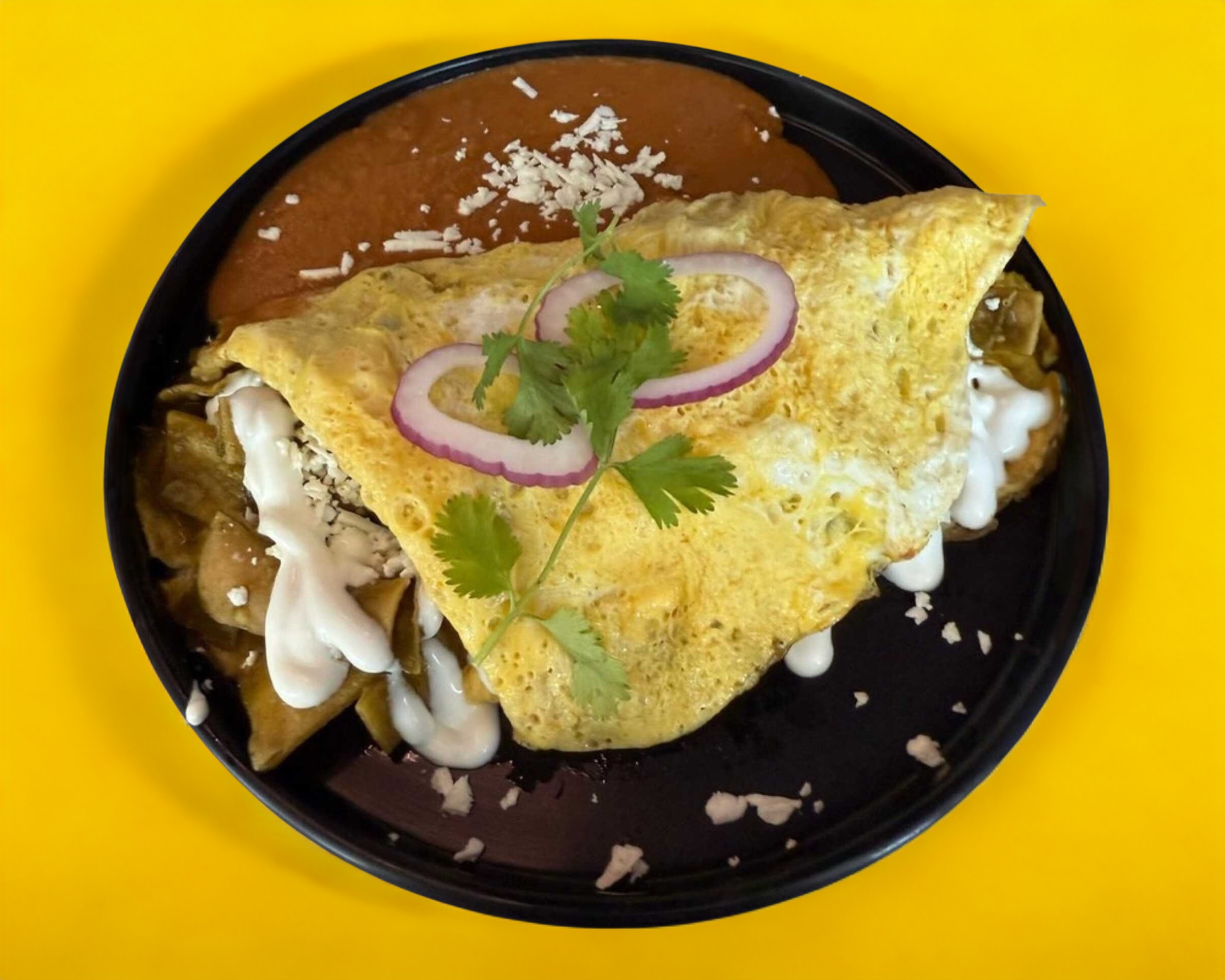 Delicioso omelette de 3 huevos relleno de chilaquiles, sobre una cama de frijoles negros, acompañado con la salsa de tu elección e ingredientes a tu gusto