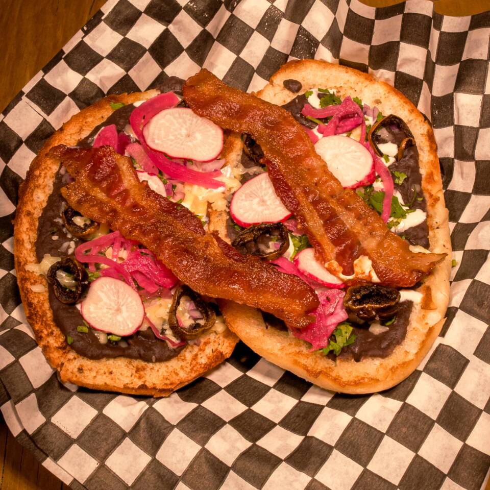 Molletes de pan lagunero, con frijoles negros refritos, queso Chihuahua derretido, acompañados de ingredientes frescos y salsa de la casa.
