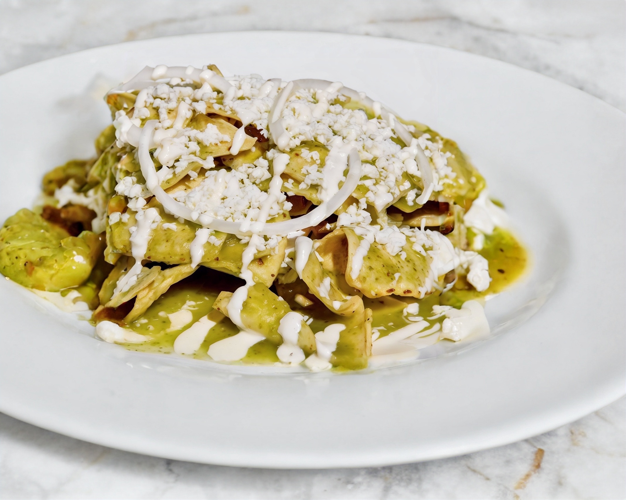 Deliciosos chilaquiles Verdes ( porción personal) acompañados de cebolla, cilantro y crema