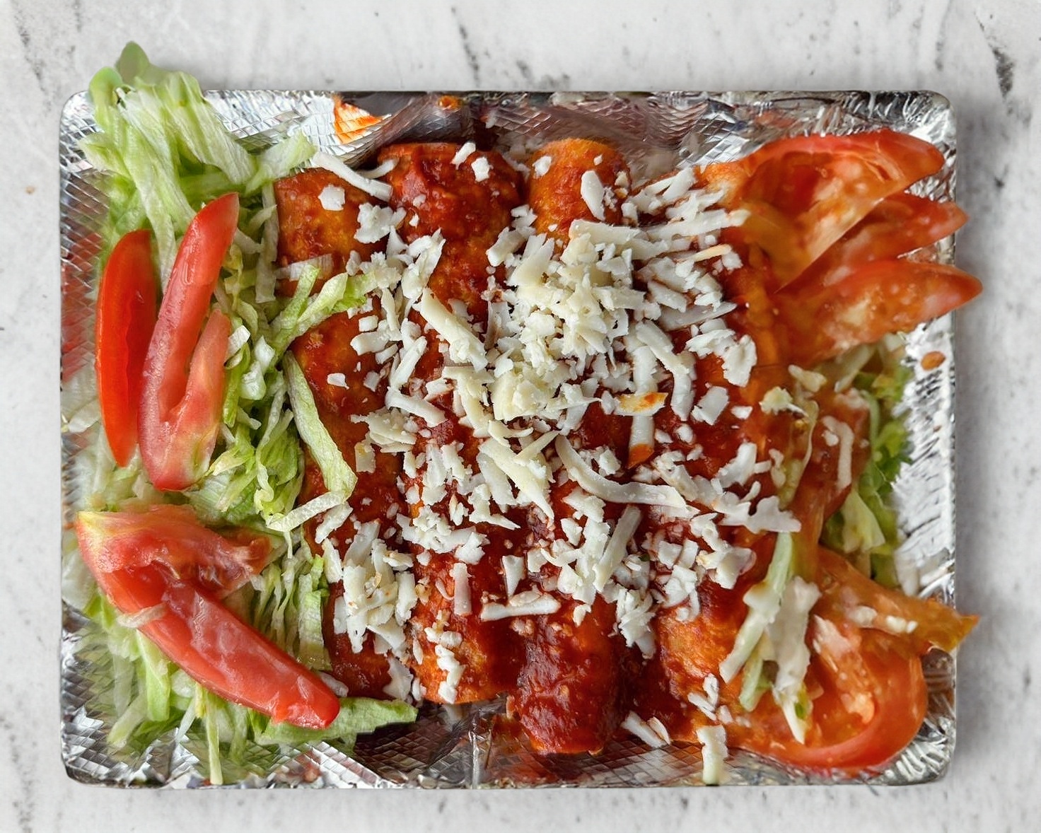 Deliciosas Enchiladas rojas con queso, acompañadas de lechuga y tomate