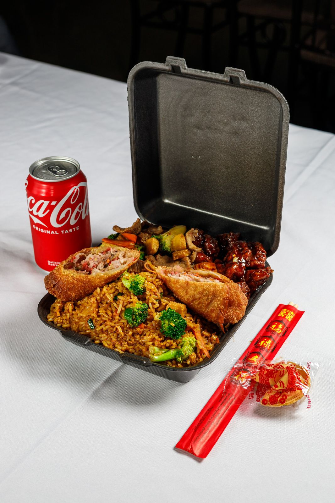 Arroz, 1 guiso, 1 rollo primavera y un refresco.