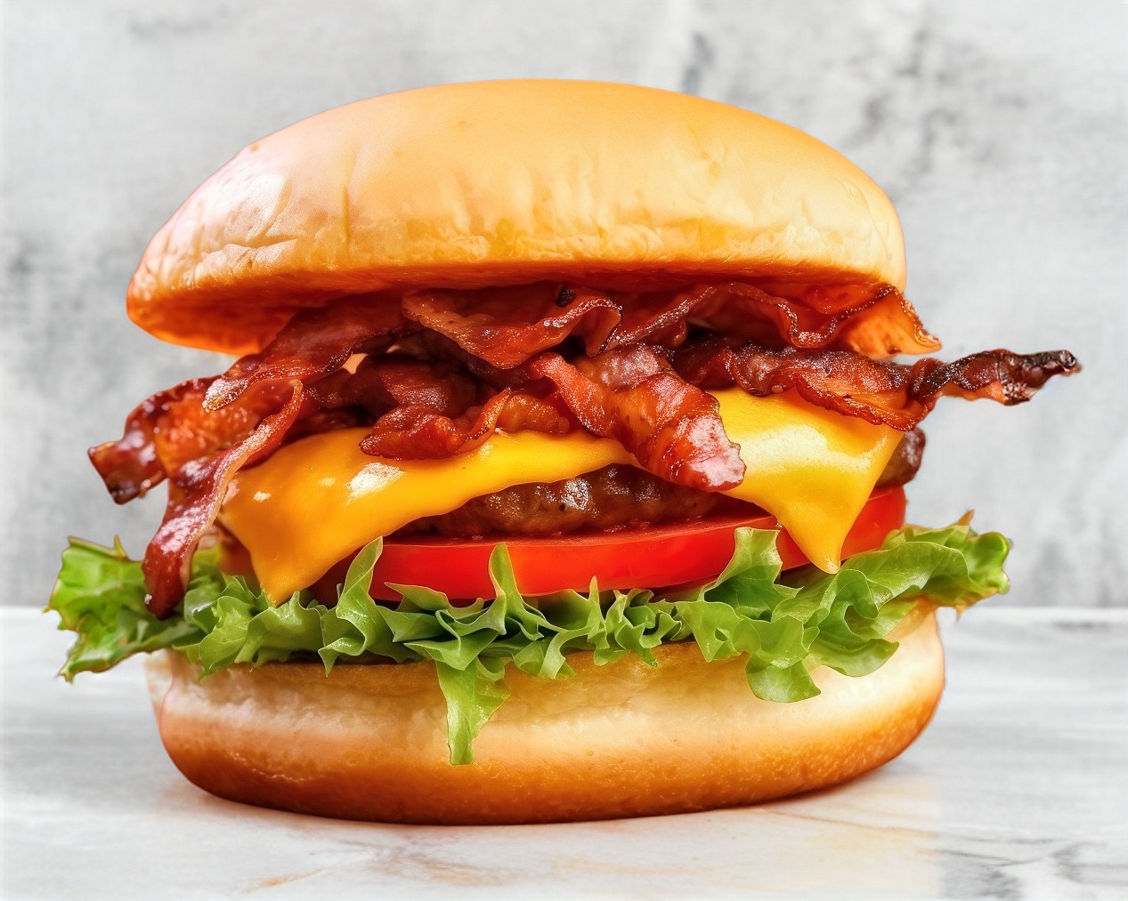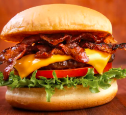 Smash burger de jugosa carne de res marinada y sazonada por nosotros, queso americano, tocino, cebolla caramelizada, pepinillos, lechuga fresca rebanada, mostaza y aderezo de la casa.
