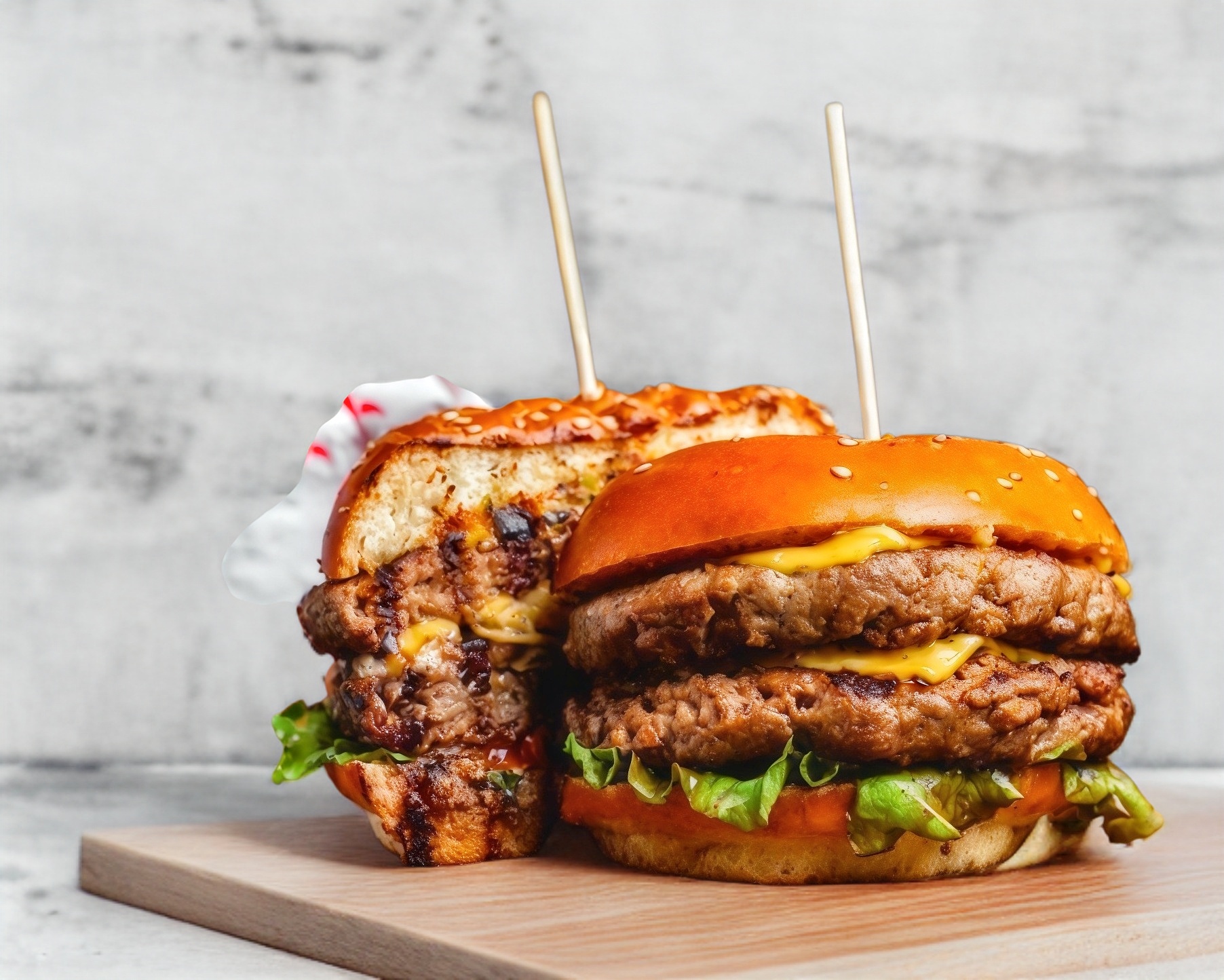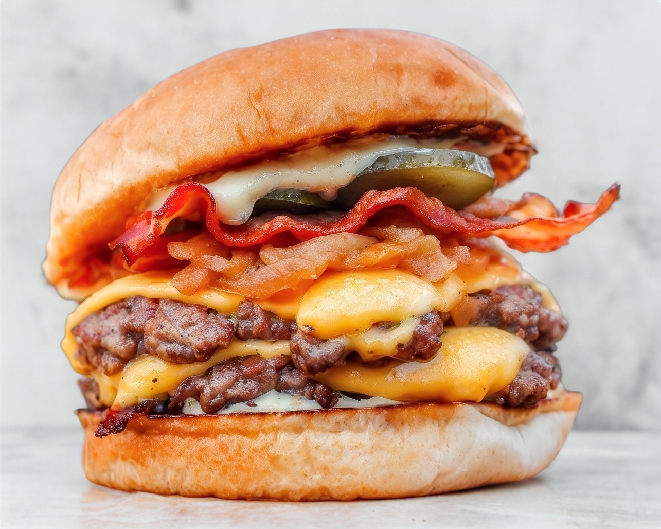 Smash burger de jugosa doble carne de res marinada y sazonada por nosotros, queso americano, tocino, cebolla caramelizada, pepinillos, lechuga fresca rebanada, mostaza y aderezo de la casa.