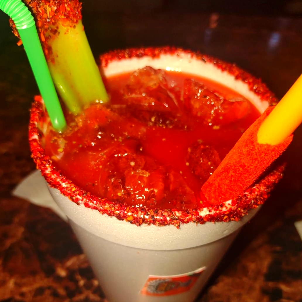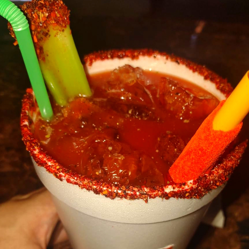 Clamato, especias, apio, palito de tamarindo, vaso escarchado