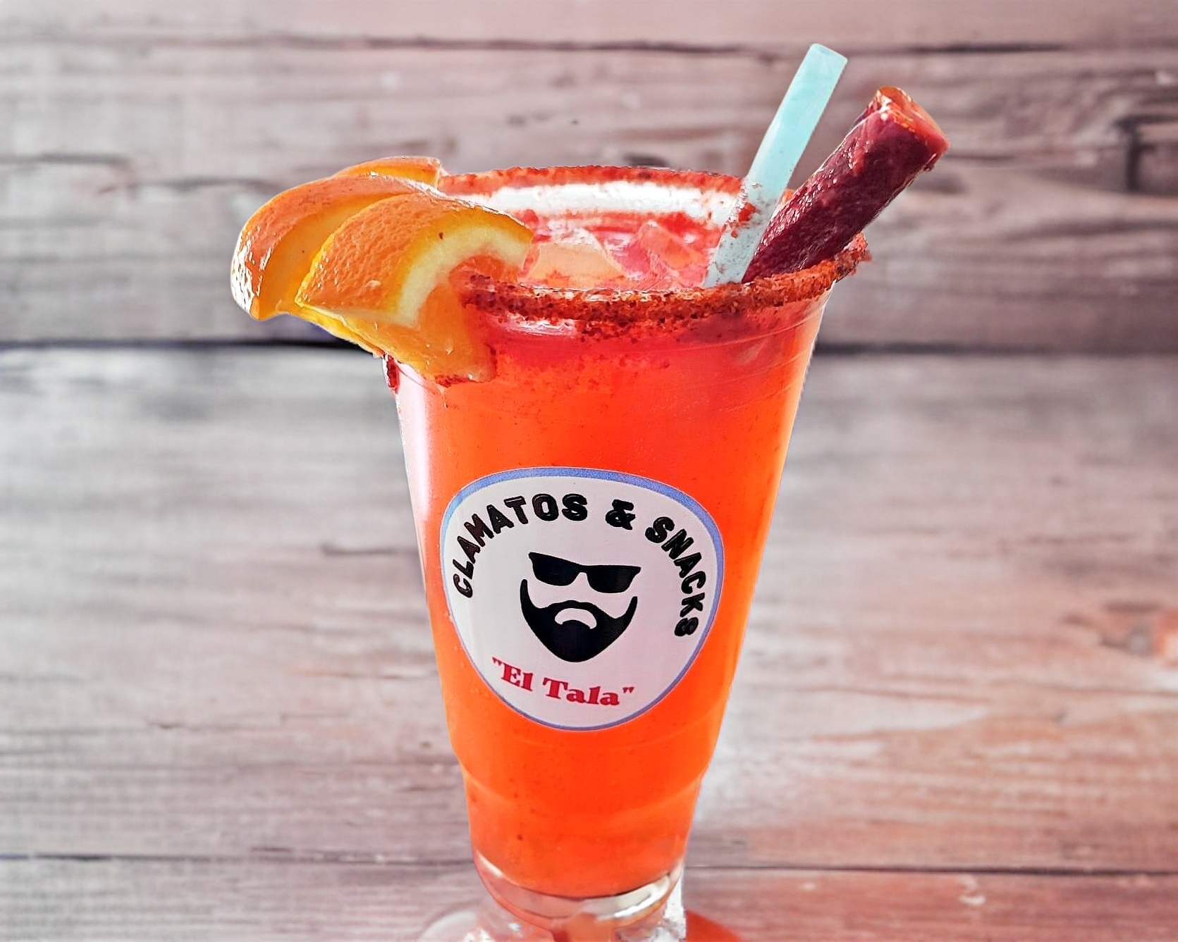 Vaso preparado con refresco de toronja, agua mineral, limon, sal, tajin y un ligero toque de chamoy.(Acompañado de banderilla de tamarindo y rodajas de naranja)