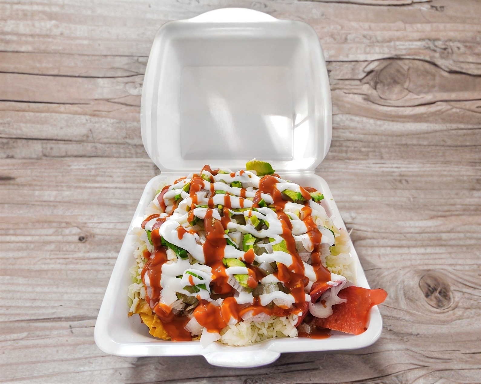 2 Tostitos a elegir con doble porción de repollo, cueritos, aguacate, crema y salsa valentina.