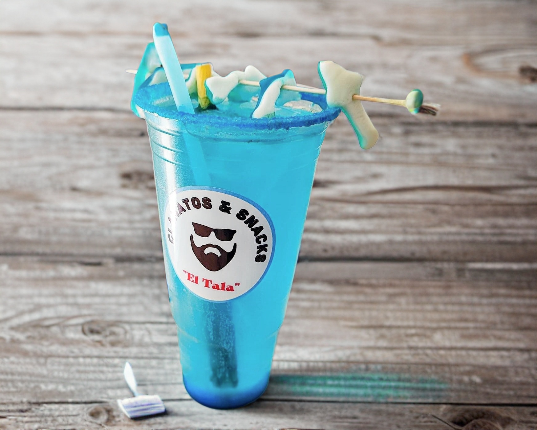 Vaso preparado con powerade, bebida energizante, y refresco de lima limón.(acompañado de gomitas y banderilla de mora azul)