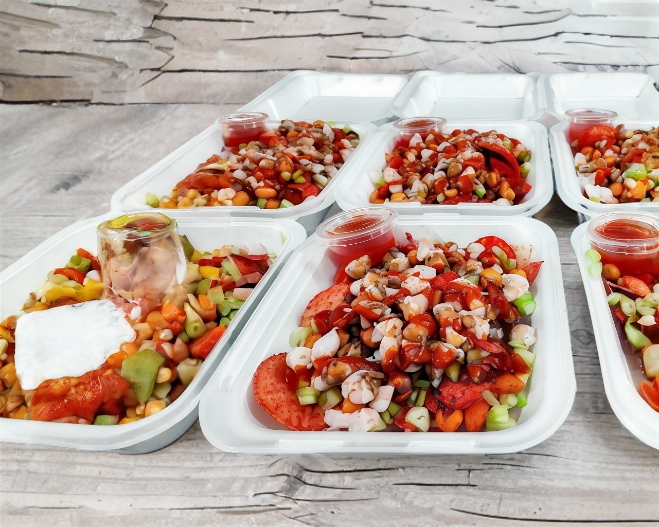 2 Tostitos a elegir, doble porción de contenido, pepino, cacahuate, camarón cocido, carne seca, salsas negras y picante, (porción de clamato en vaso de 2 oz a parte).