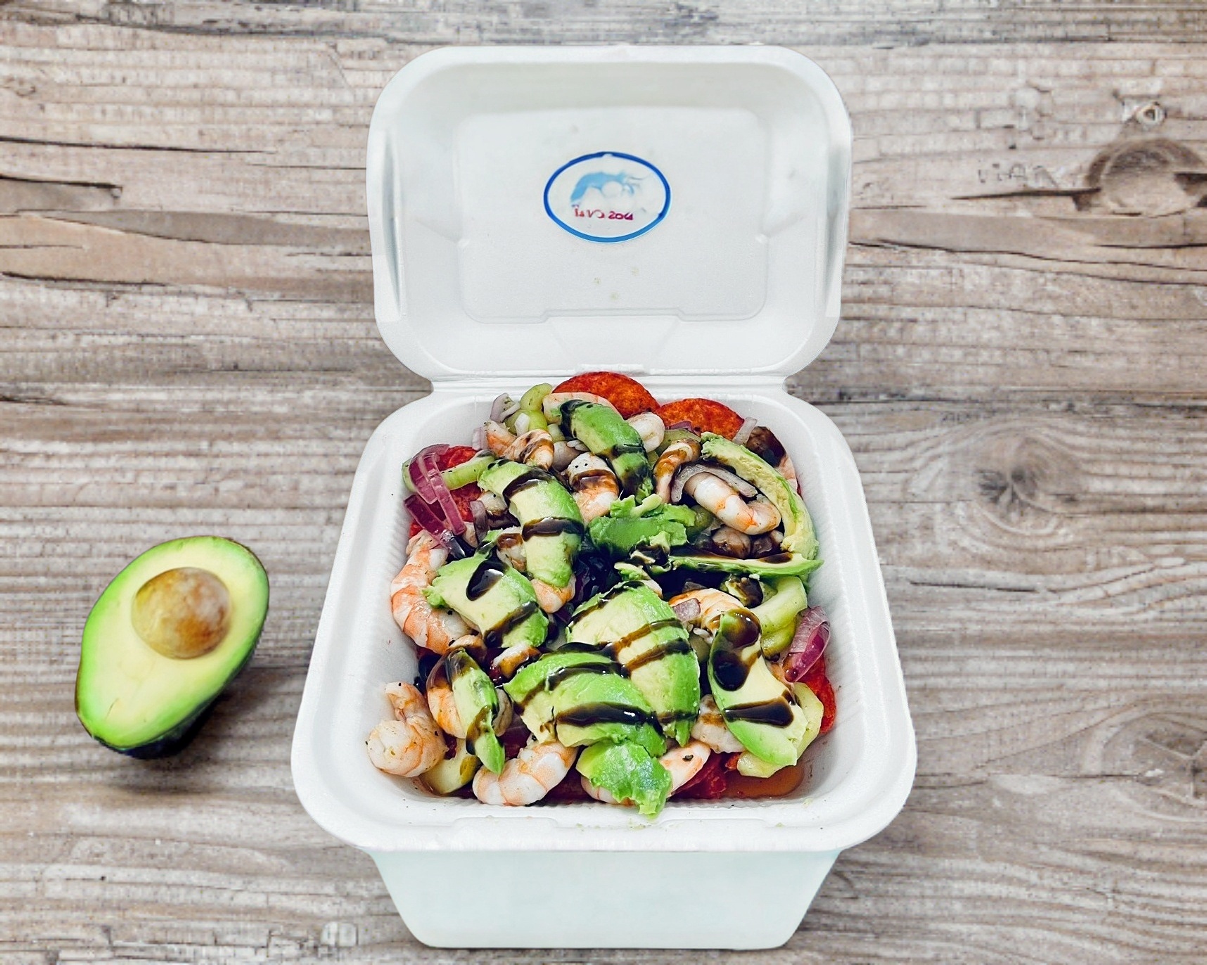Coctel de camarón de 1/2 litro con pepino, cebolla, cilantro, apio, aguacate salseado y clamato. con sus respectivas galletas saladitas.