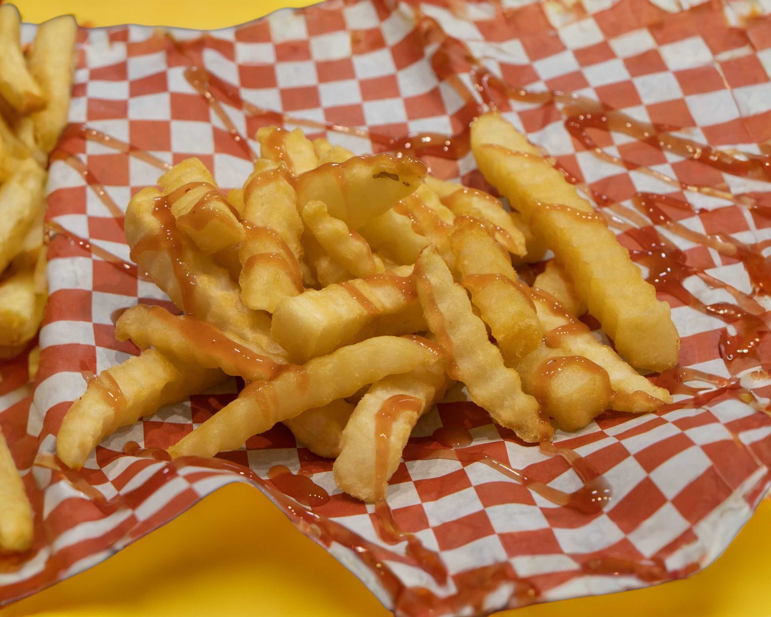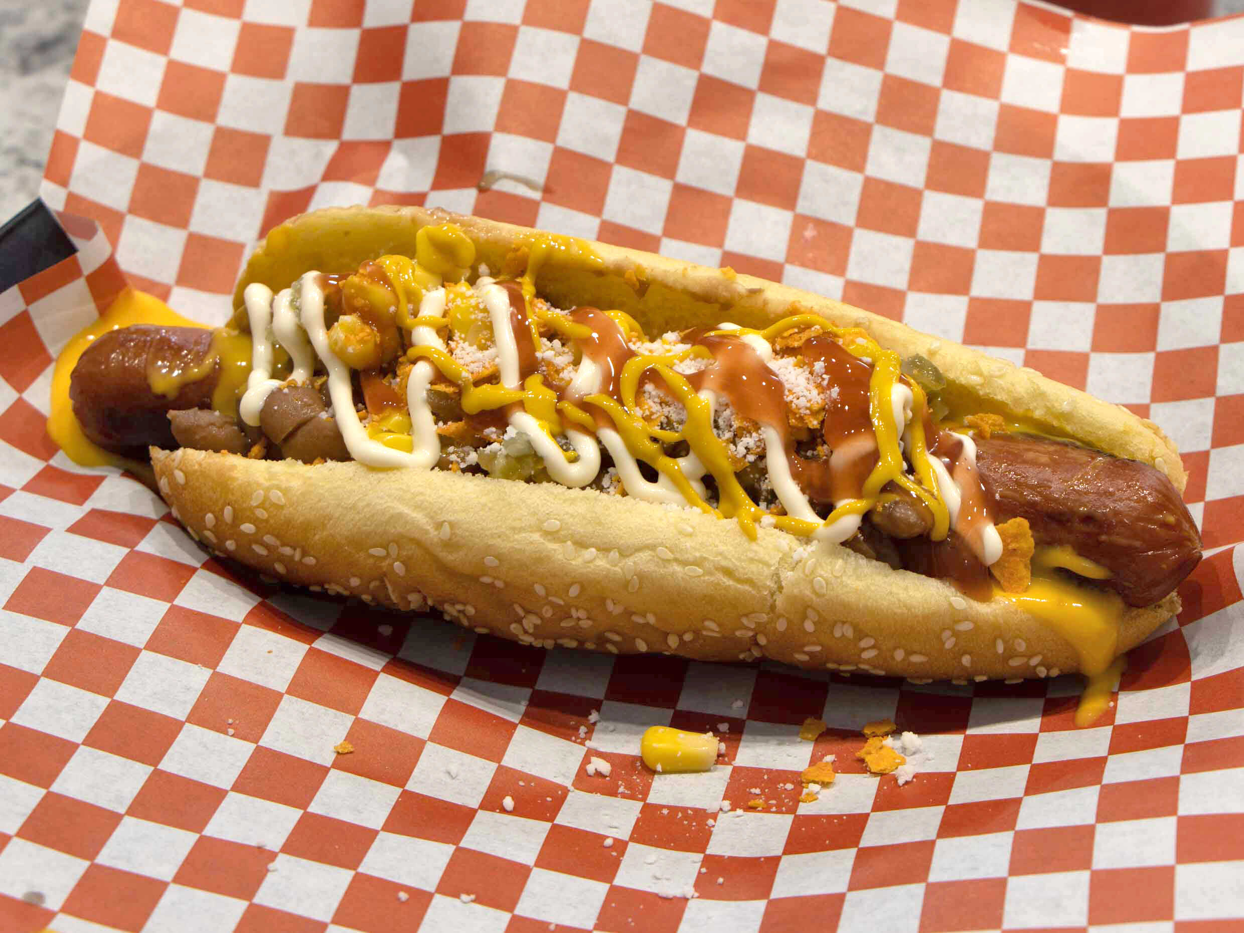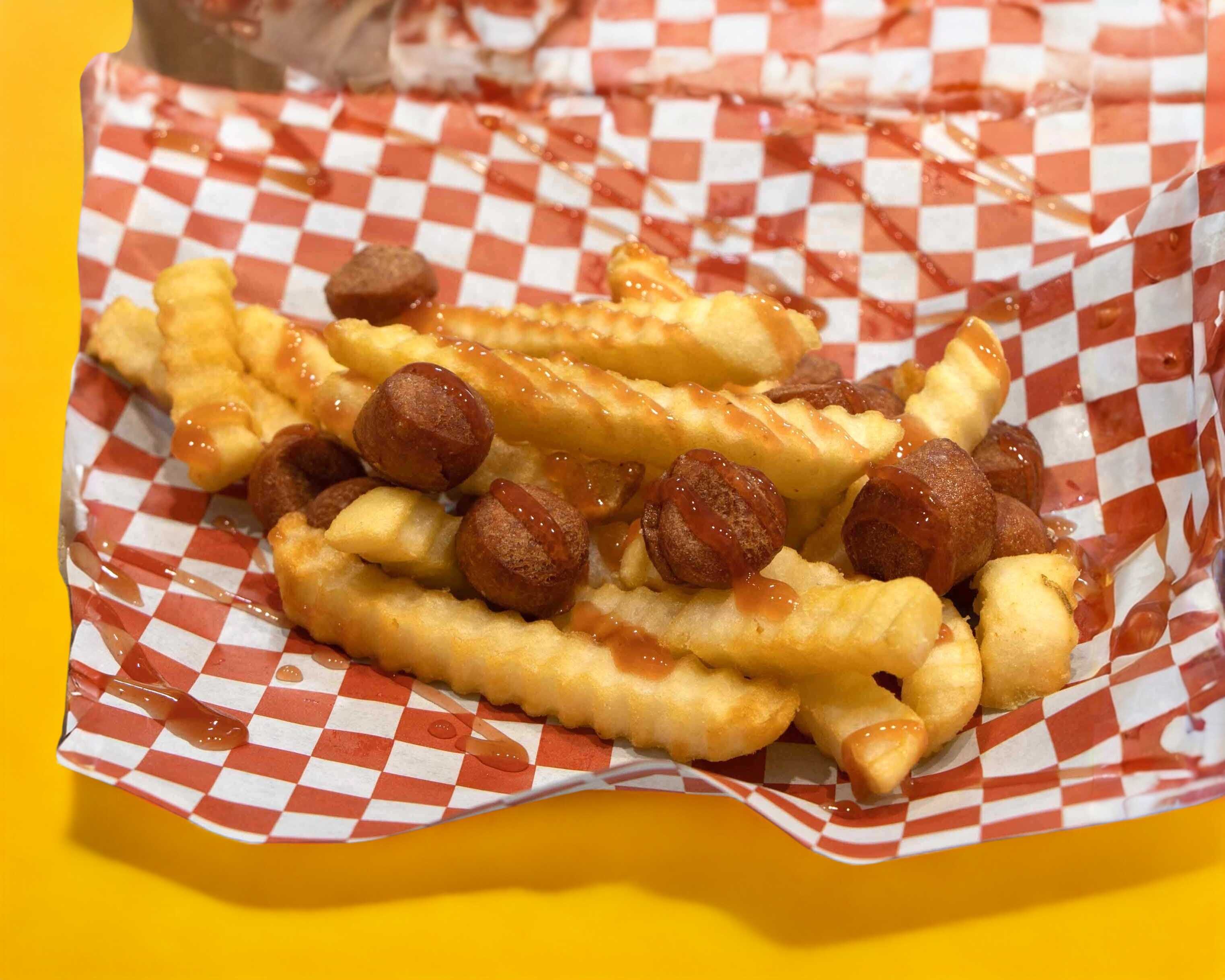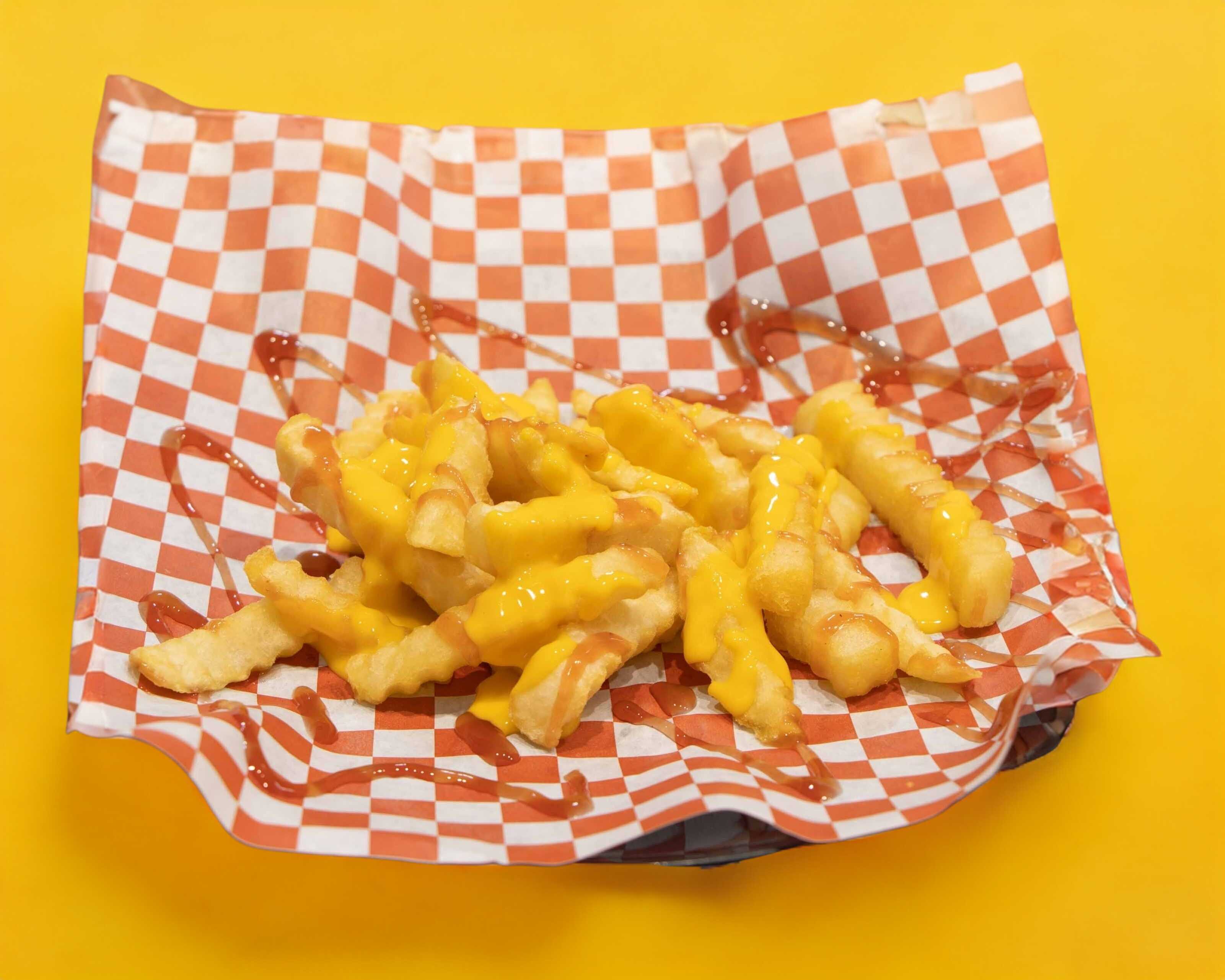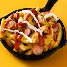 Aproximadamente 200 g a 250 g de papas francesas, salchicha winnie, queso de cheddar, salsa casera.