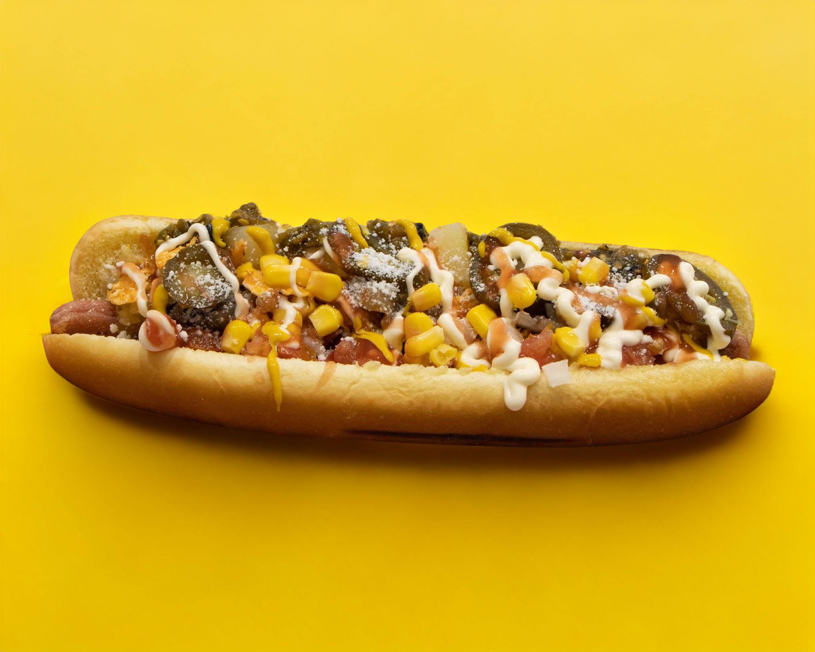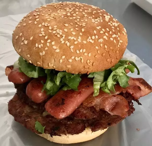Carne 100 % sirloin, queso amarillo, tocino, jamón, winnie, pepinillos, lechuga, tomate, aderezos.