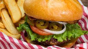Hamburguesa al carbón 100% sirloin con lechuga, tomate, queso y chile.