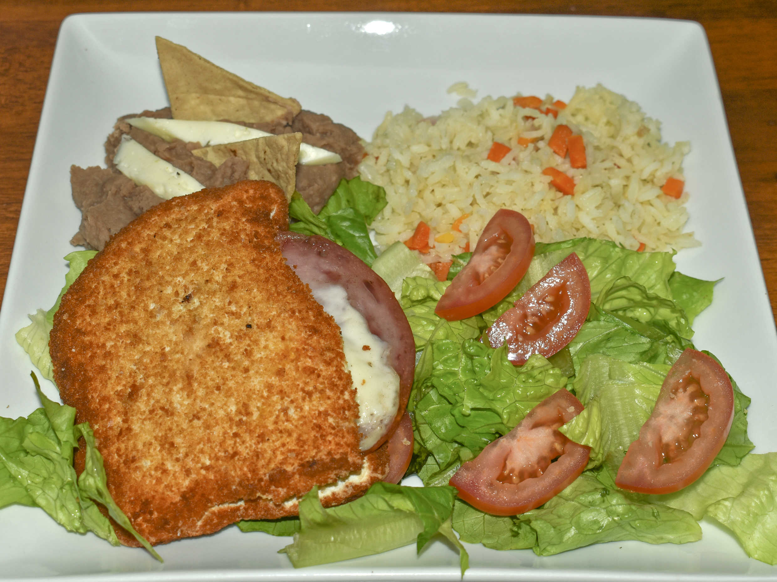 Pechuga de pollo empanizada, sopa del día, frijolitos, acompañada de tortillas y salsa.