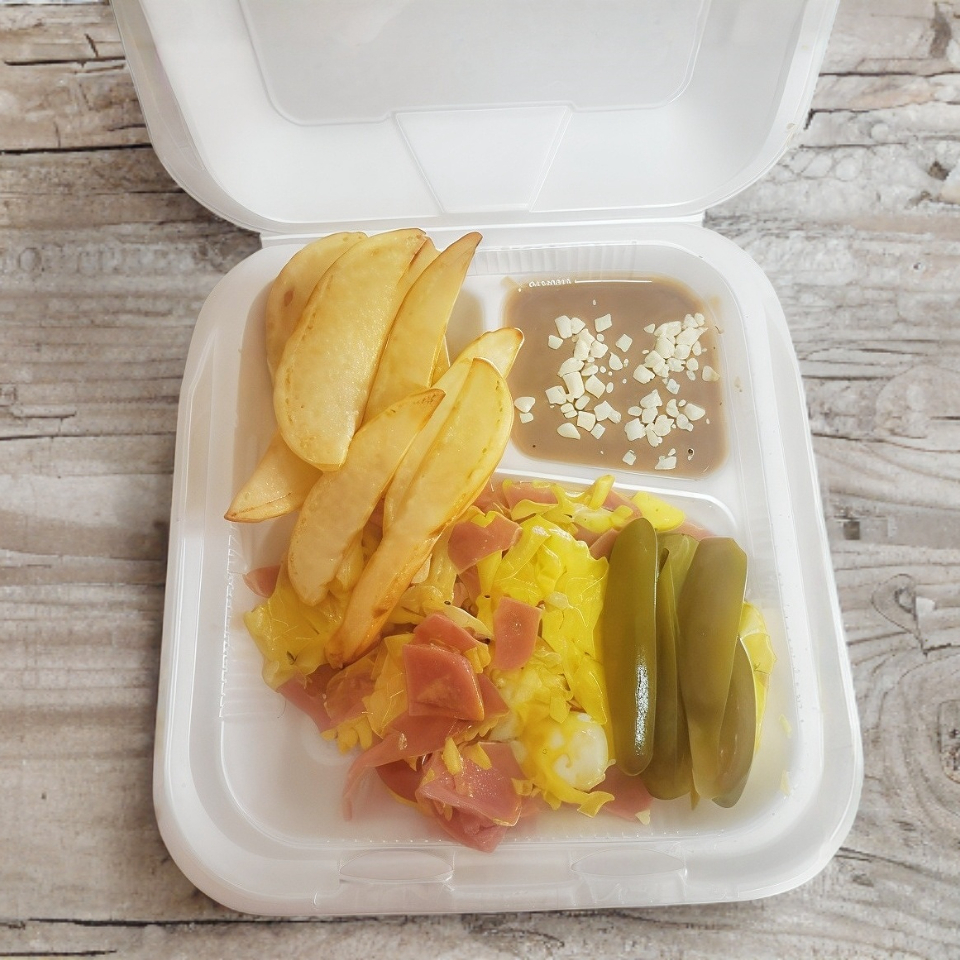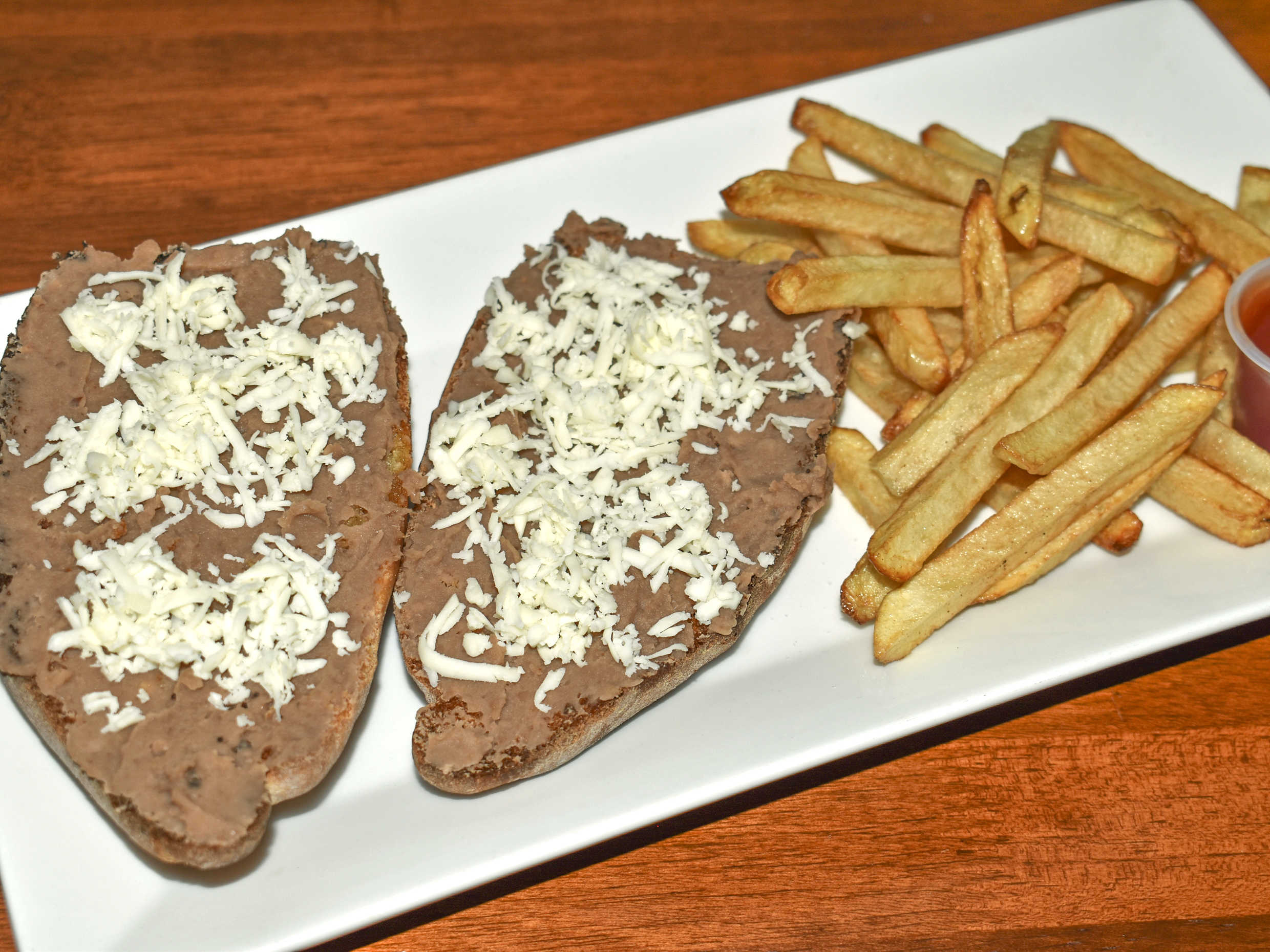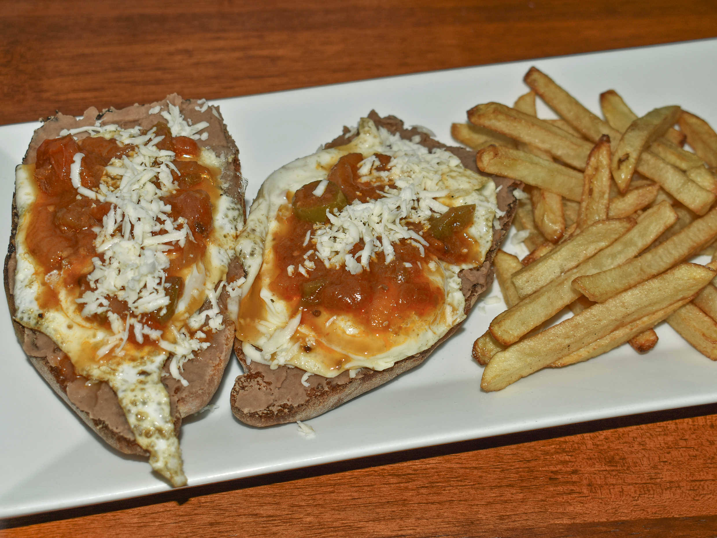 Rico pan tostado con mantequilla y frijoles con rico queso menonita, montados con huevo estrellado o en torta y bañados con salsa ranchera acompañado de papas fritas y chilitos curtidos