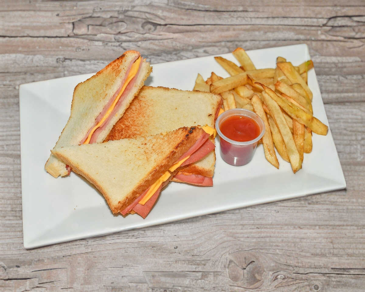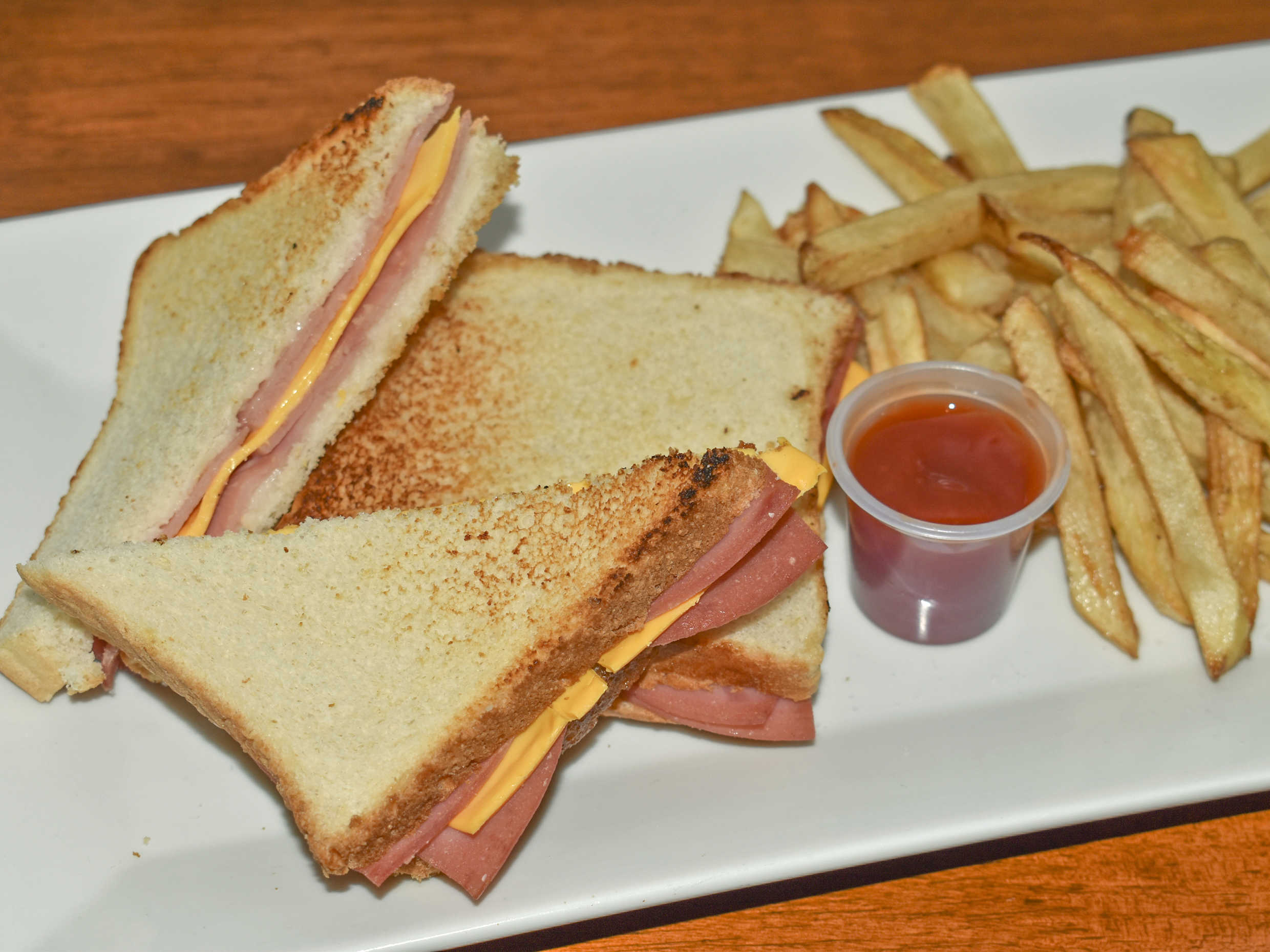 Ricos sándwiches con jamón y queso tostados a la plancha con huevo estrellado o en torta acompañados de frijoles y papas fritas.