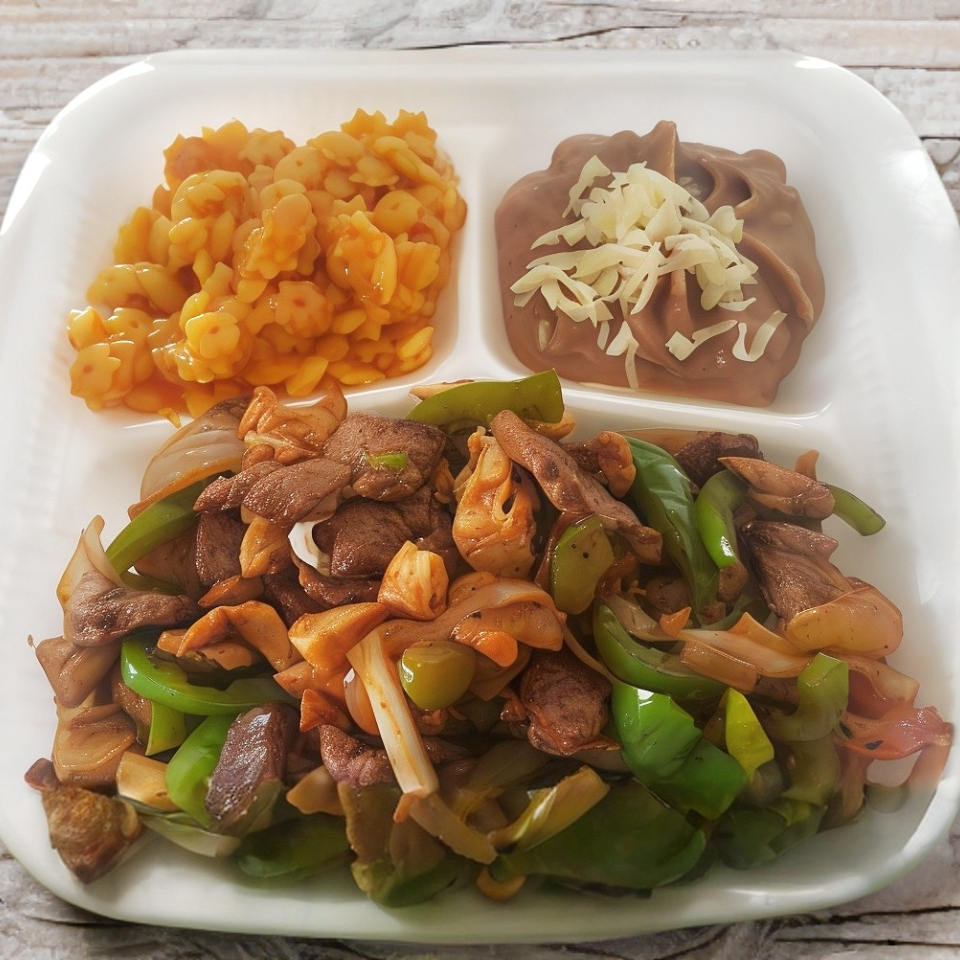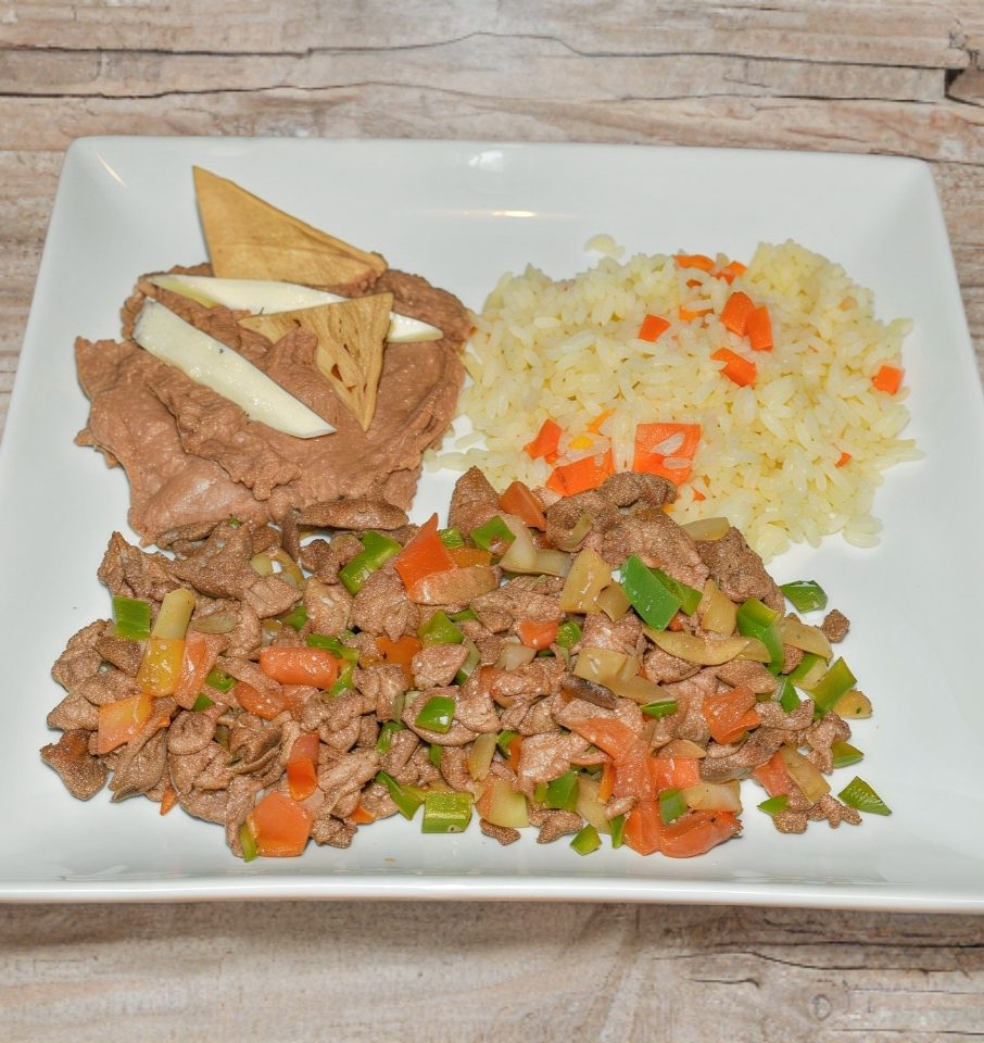 Bistec a la plancha cocinado con chile, tomate y cebolla acompañado de sopa del día y frijoles.