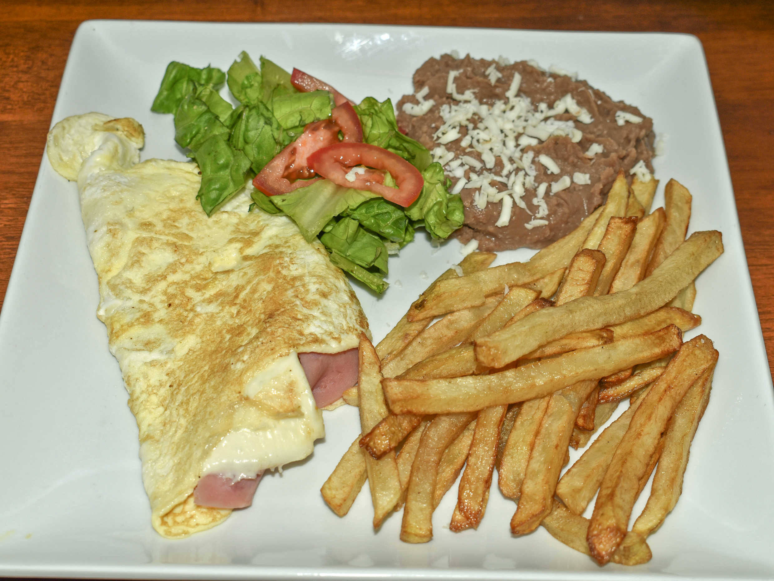 Rico omelette de huevo relleno de su ingrediente preferido, acompañado de frijoles y papas fritas.