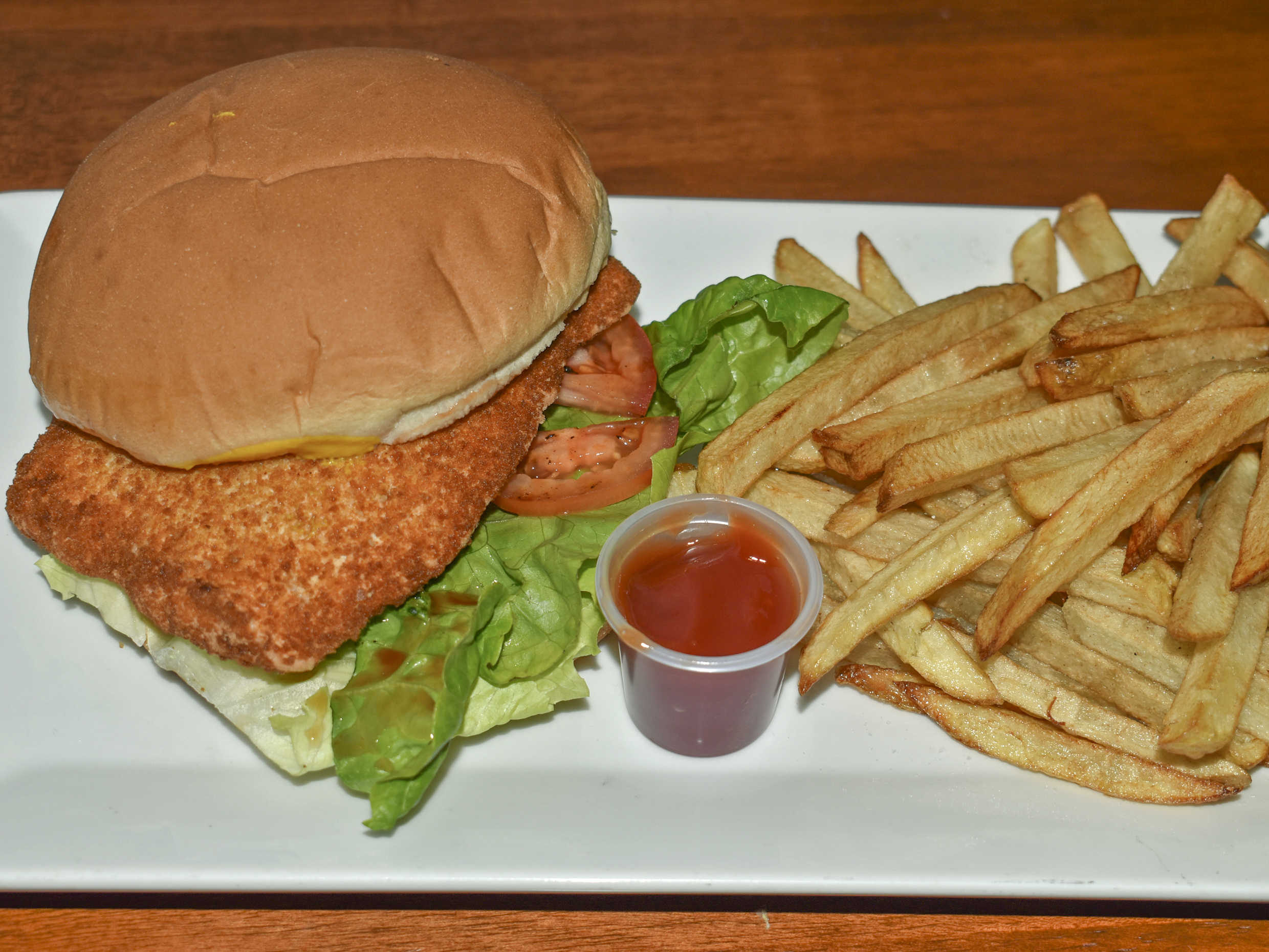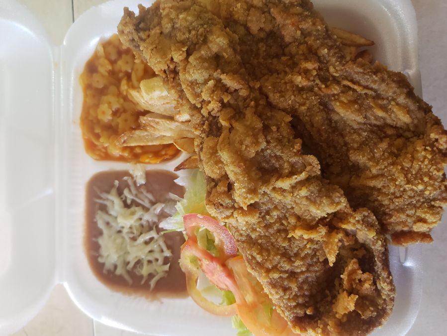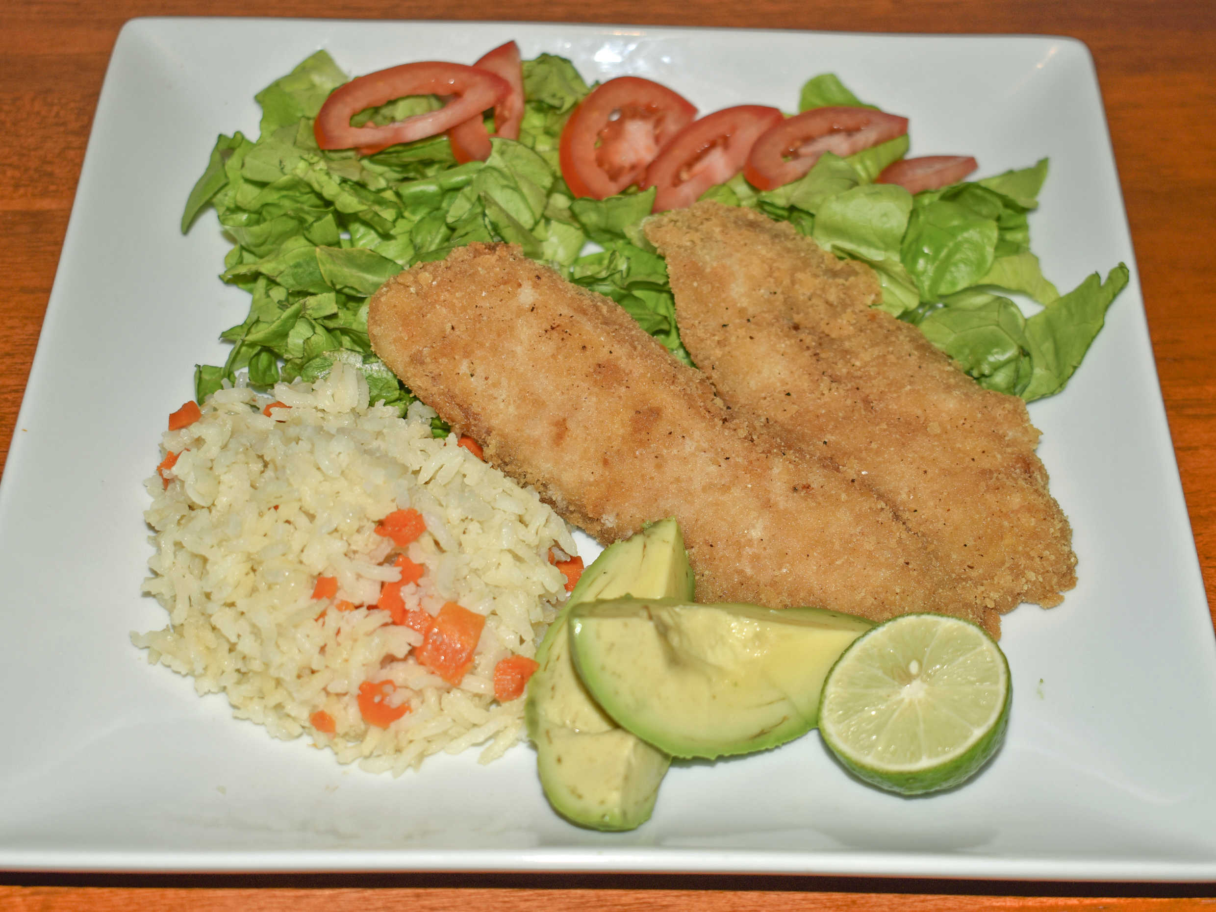 Filete de pescado empanizado acompañado de sopa del día y frijolitos.
