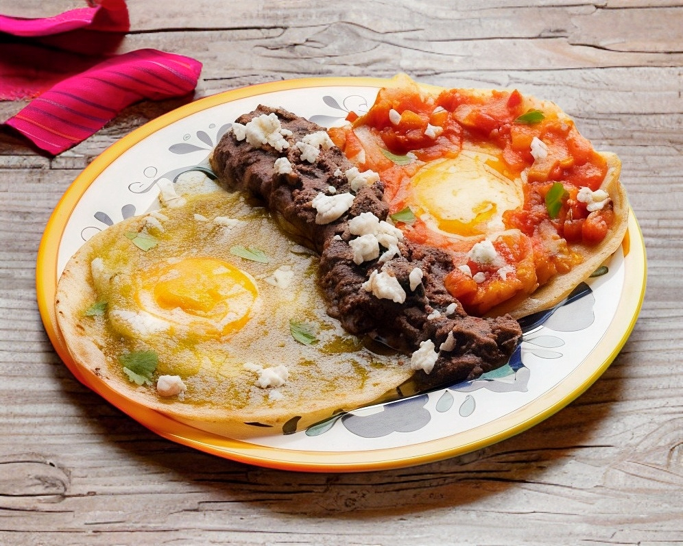 Ricos huevos estrellados o en torta, montados en ricas tortillas fritas bañadas en salsa una en salsa roja y la otra en salsa verde acompañada de frijoles y papas fritas.