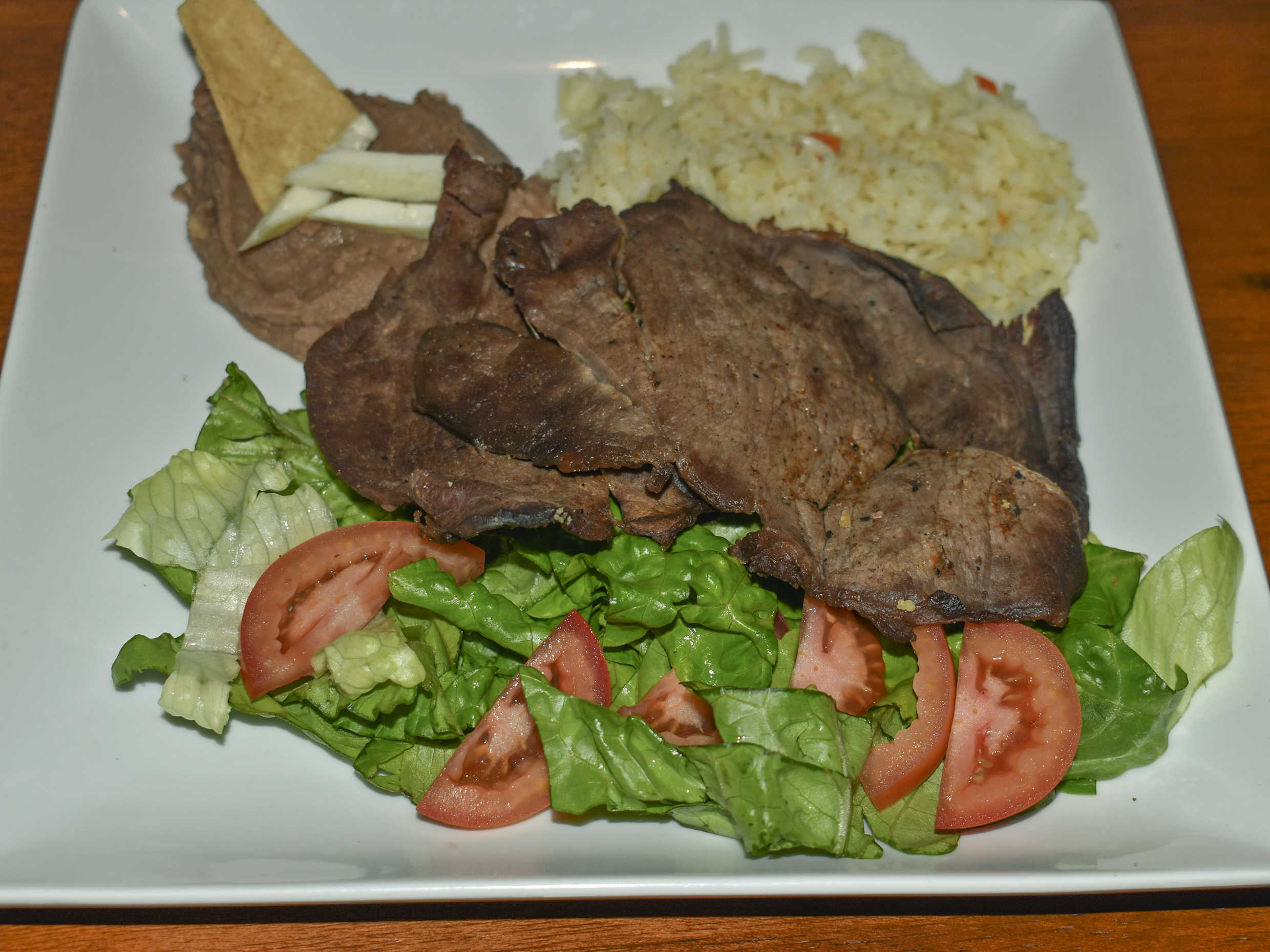 Bistec asado a la plancha acompañado de ensalada, sopa del día y frijoles.