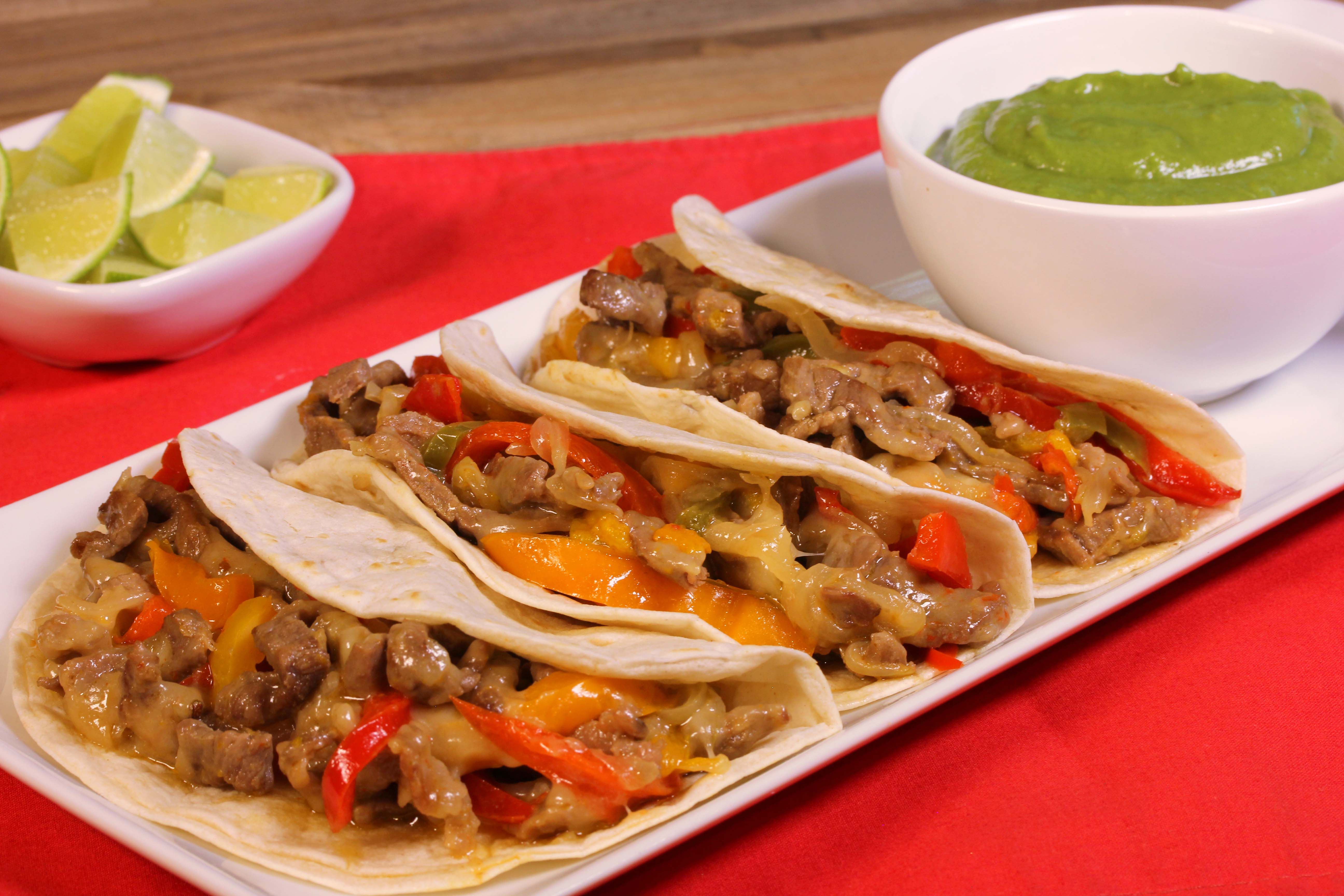Orden de 5 tacos de carne de res, tocino, cebolla y morrón, bañados en queso, acompañados de salsa, cebolla morada y limón.