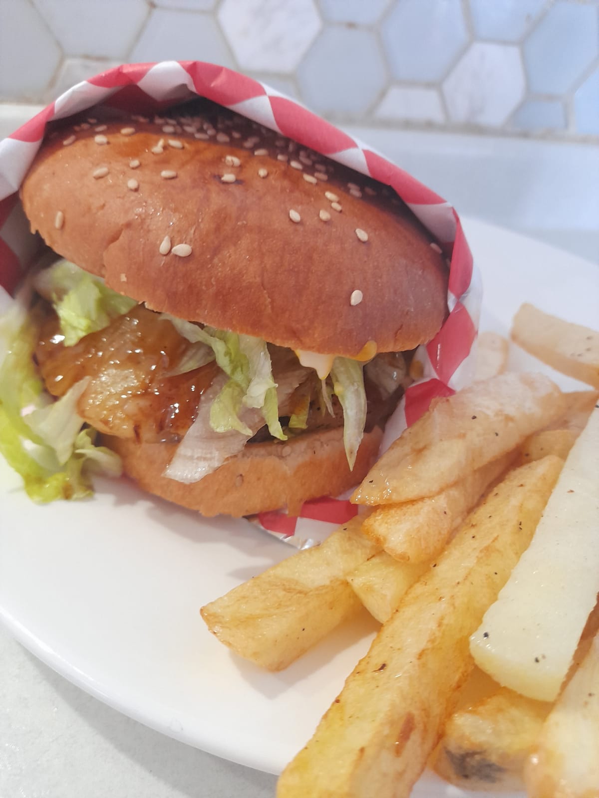 Carne de hamburgesa de 1/3 de libra, piña asada, BBQ, queso blanco, verduras y aderezos, incluye papas fritas.