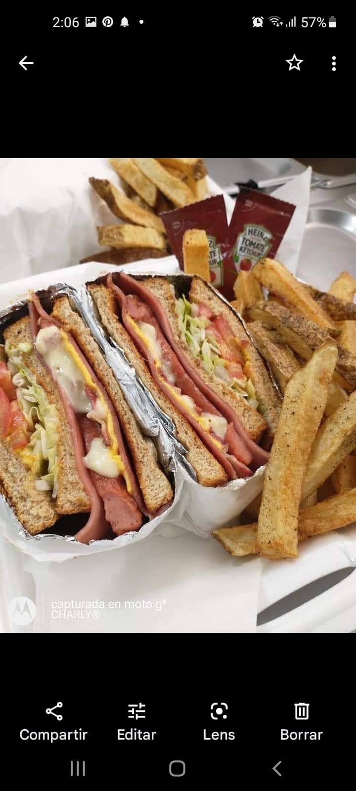 Jamón, queso amarillo, queso menonita, aderezos y vegetales, incluye papas fritas.