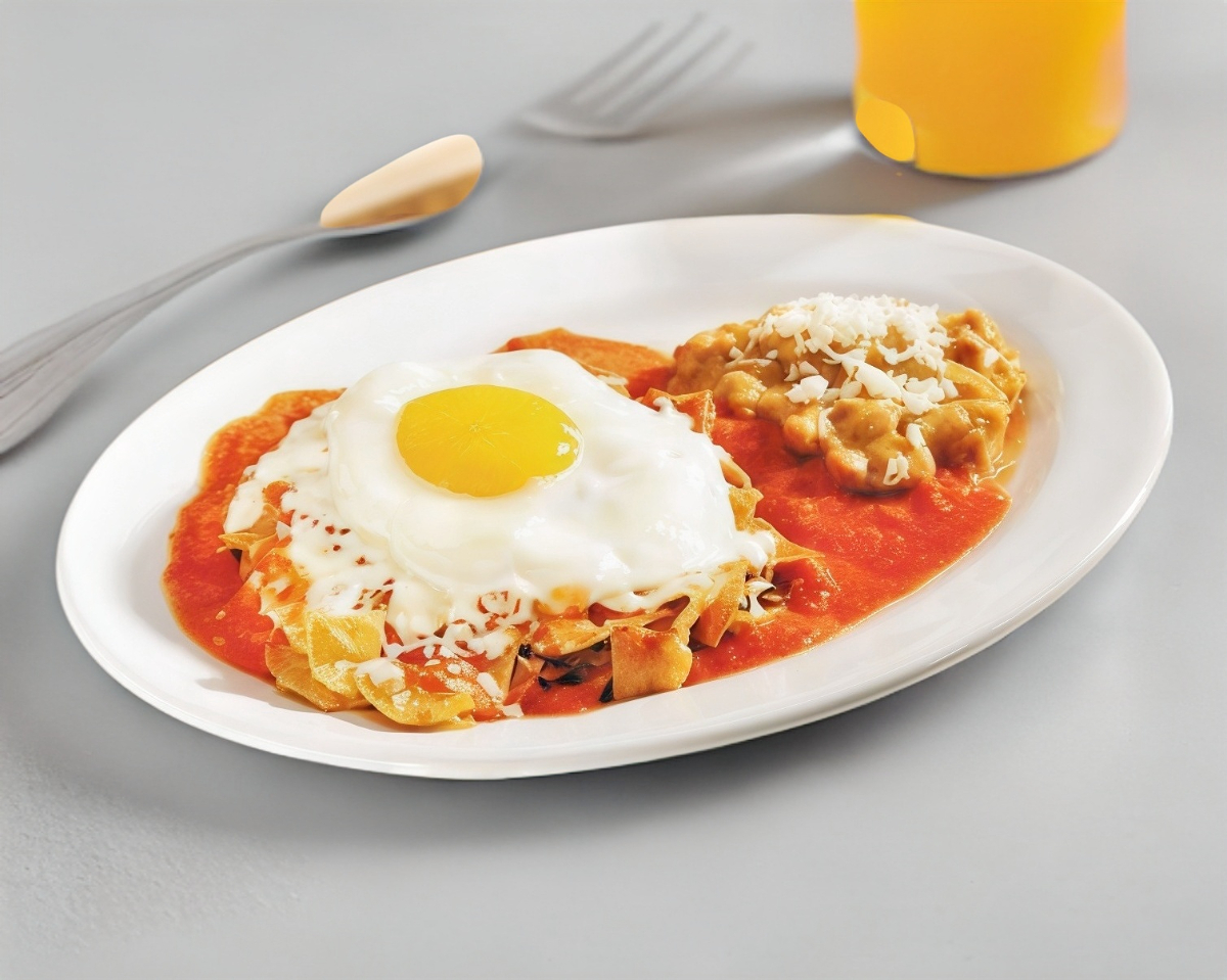 Ricos Chilaquiles bañados en salsa con queso gratinado, montados con pechuga de pollo, bistec o huevos acompañados con frijoles refritos.