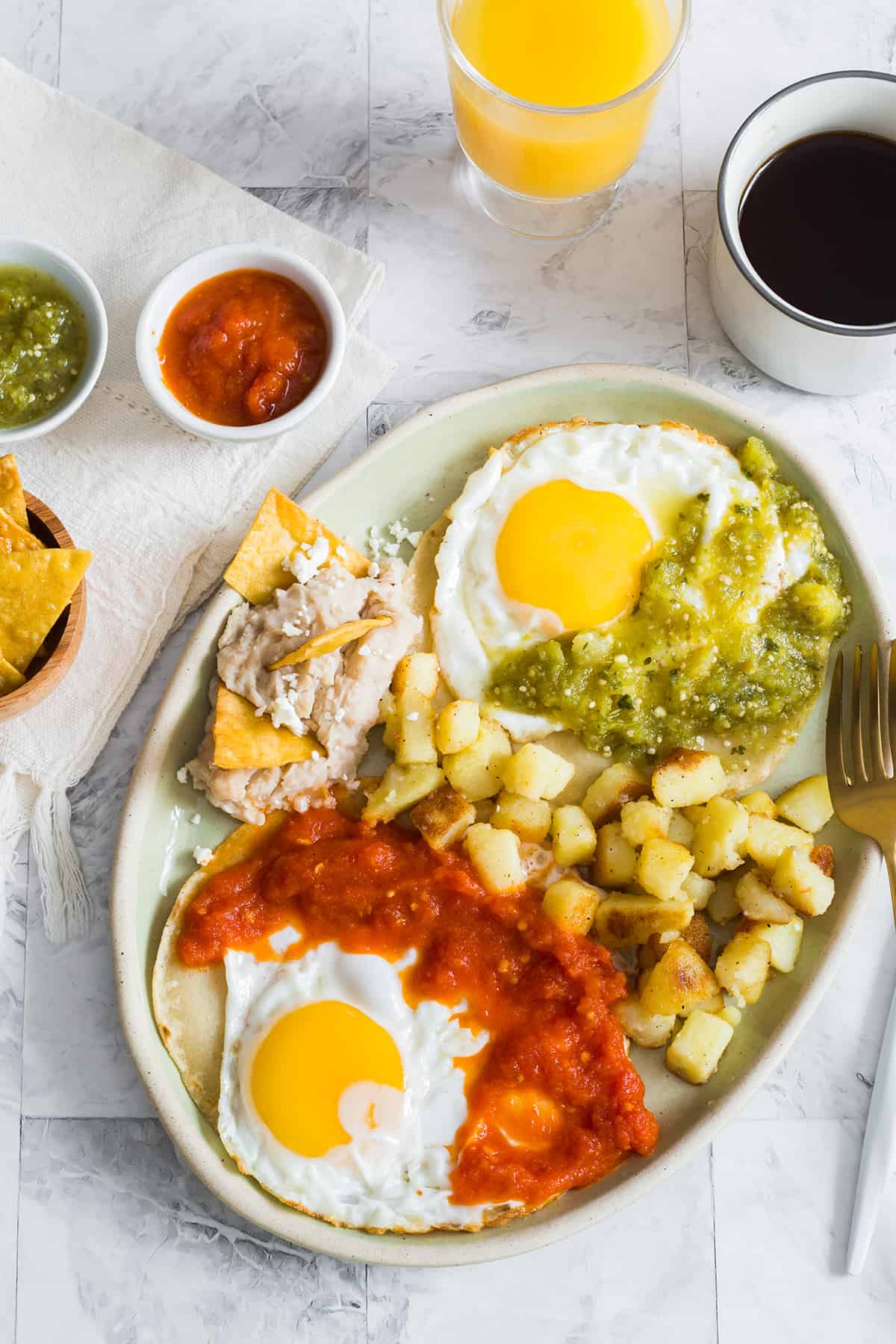 2 Huevos estrellados bañados en salsa roja y verde, acompañdos con frijoles con queso y guisado a escoger.