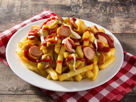 Papas fritas, queso cheddar y salchichas fritas.