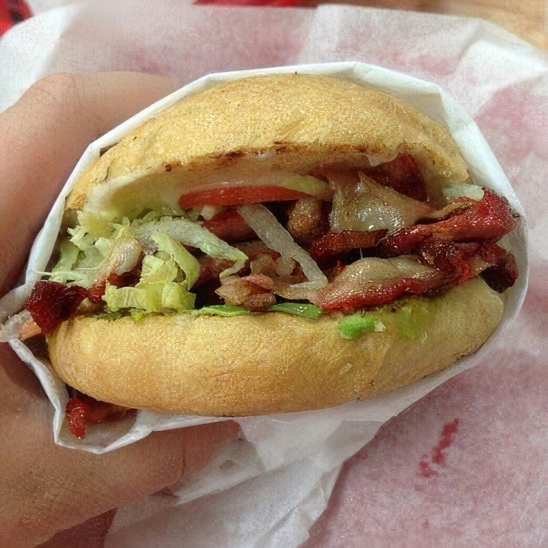 Pan de torta, colita de pavo, lechuga, tomate, aguacate, aderezos y papas fritas.