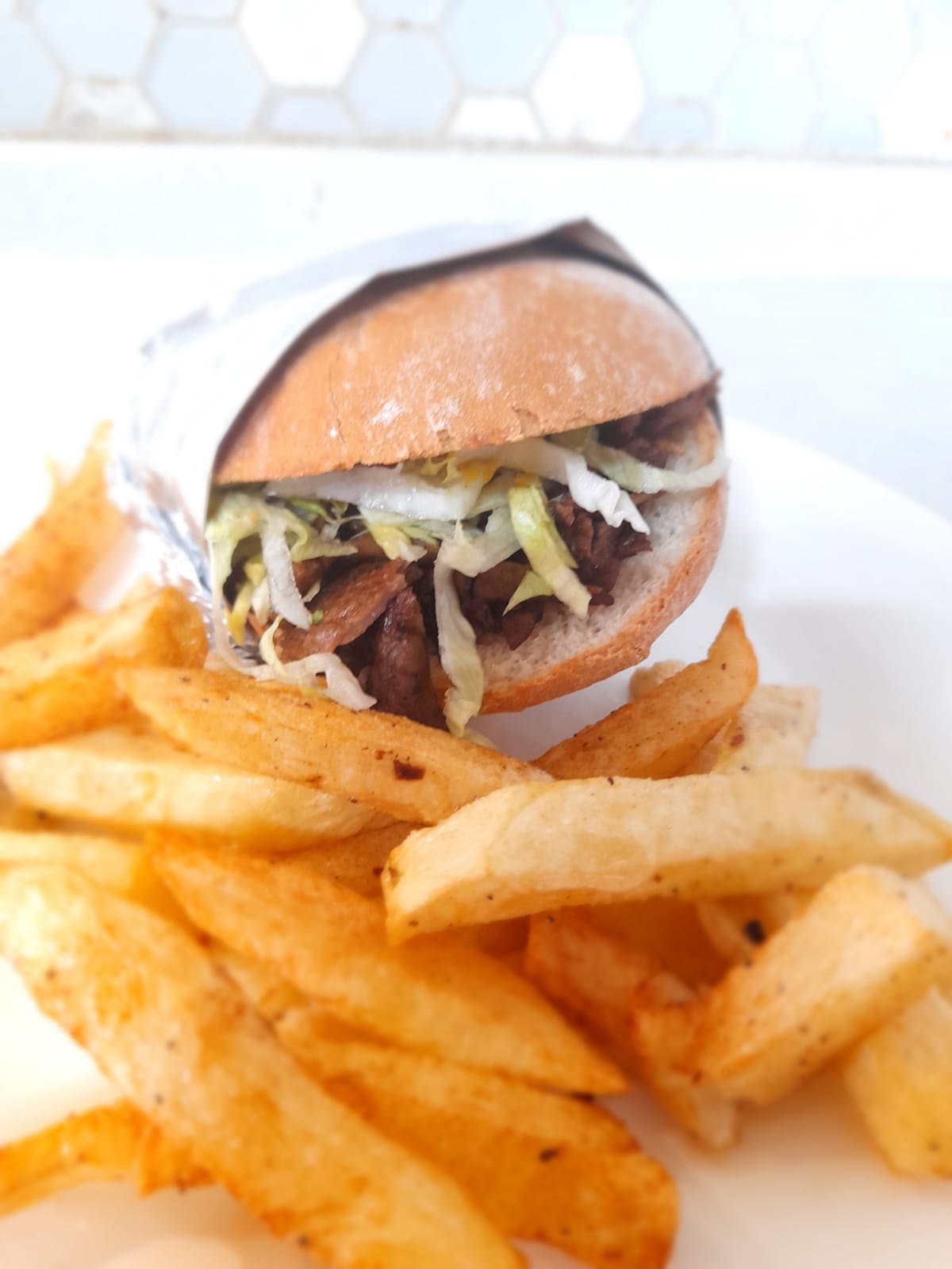 3 Piezas de pan integral, bistec a la plancha, queso menonita, lechuga, pepino, morrón, aderezos y papas fritas.