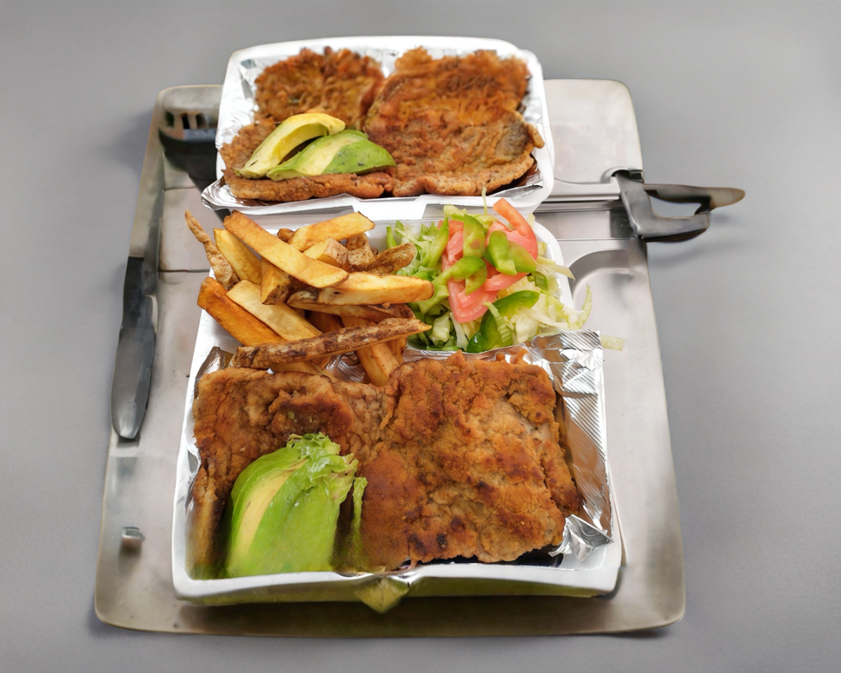 Milanesa empanizada, aguacate, vegetales y aderezos, incluye papas fritas.