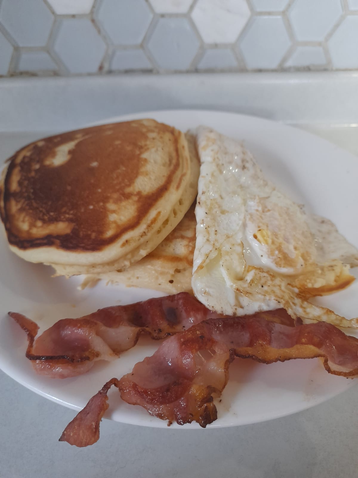2 Hot cake, 2 huevos estrellados y tocino, acompañados de miel y mermelada.