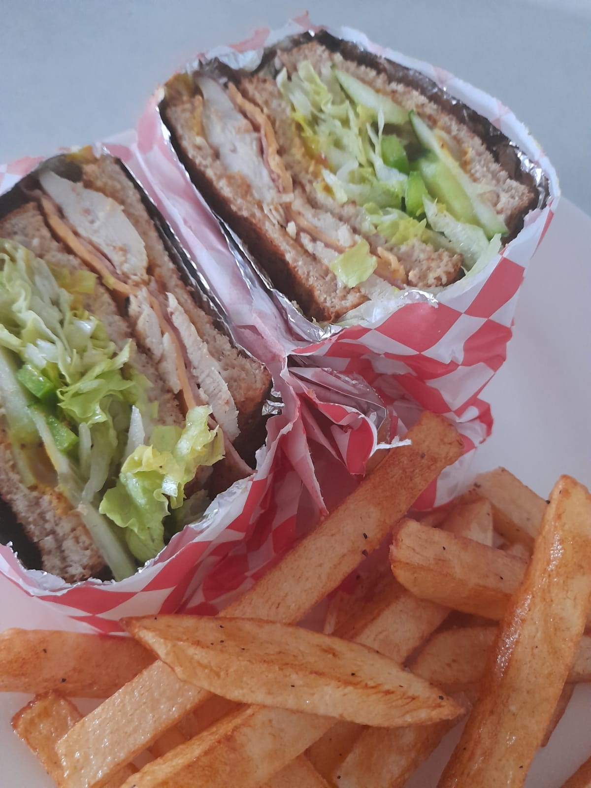 3 Piezas de pan integral, pechuga a la plancha, jamón, queso amarillo, lechuga, pepino, morrón, aderezos y papas fritas.