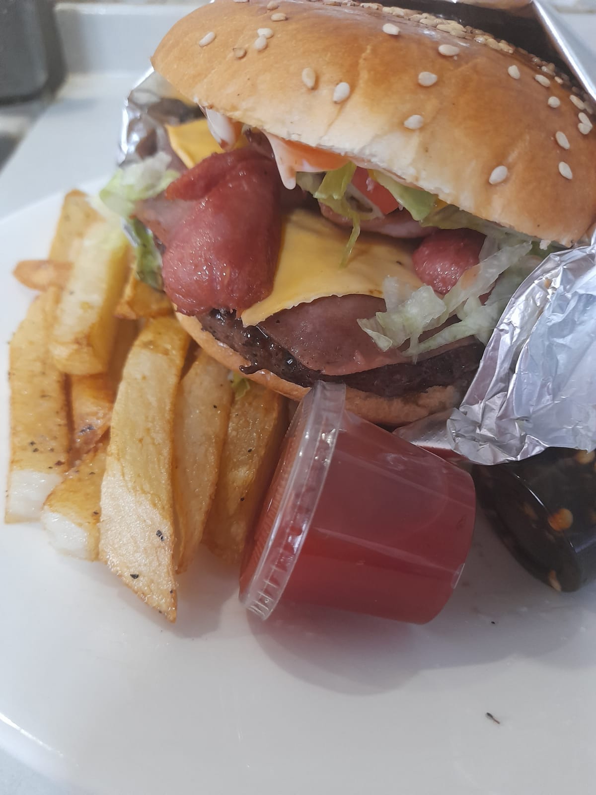Carne de hamburguesa de 1/3 de libra, 150 gr de tripitas, queso cheedar, verduras y aderezos papas fritas.