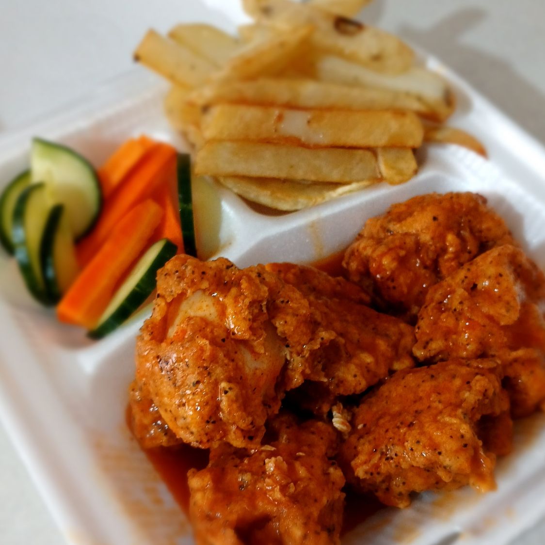 250grms de cubos de pechuga de pollo bañadas en la salsa preferida, acompañados de papas fritas, zanahoria, apio y pepino con un dip de ranch